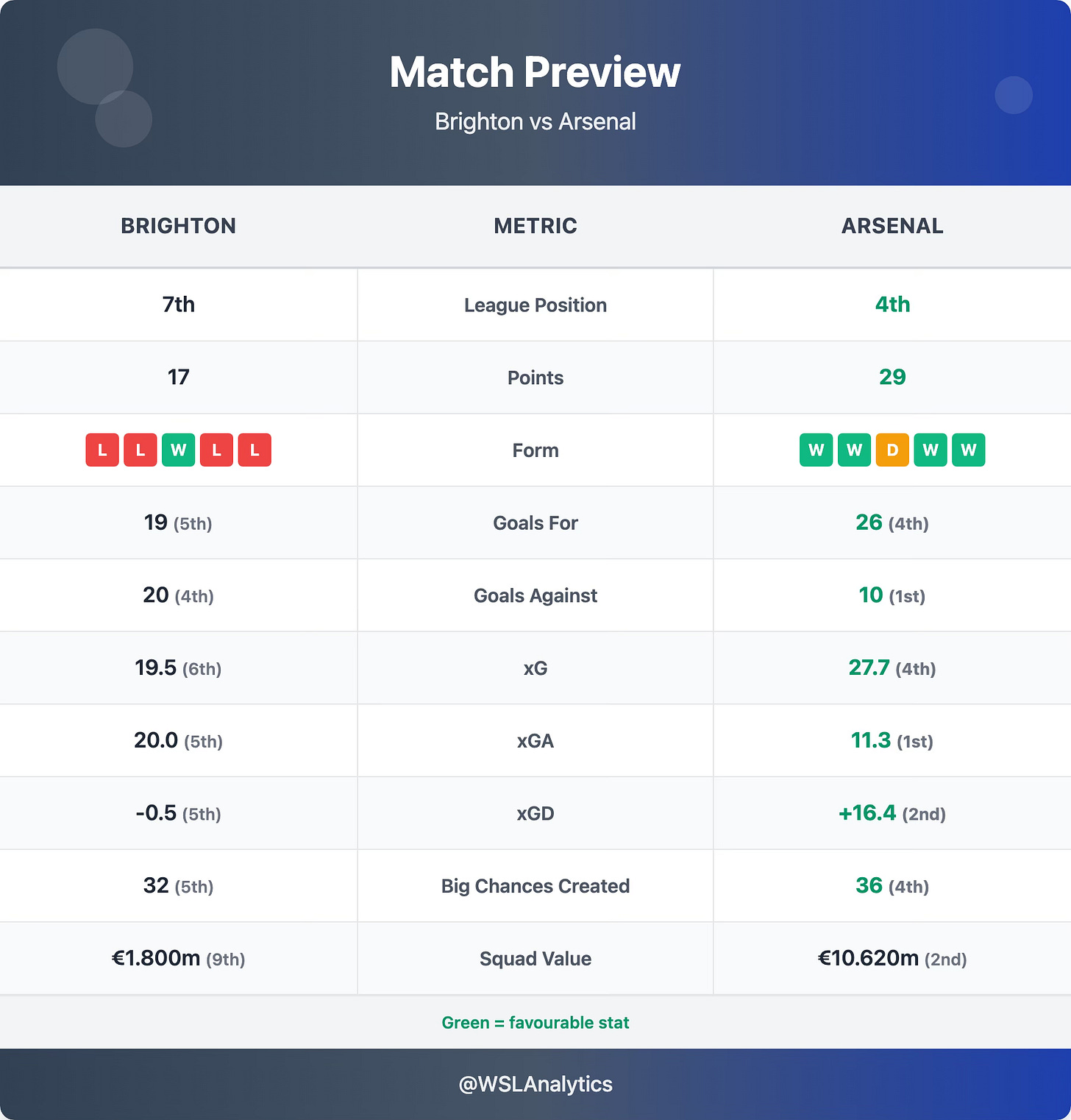 Arsenal have the best defensive record in the WSL by every major metric (11.27 xG against, 111 shots faced, 35 corners conceded – all 1st). But there’s an interesting catch: they also make the fewest blocks (27, last), fewest clearances (193, last), fewest tackles (216, last), and fewest interceptions (106, last) in the league. Arsenal don’t defend – they just prevent. Brighton’s aerial dominance is the kind of weapon that can bypass possession control entirely, and Arsenal are vulnerable in that area.
