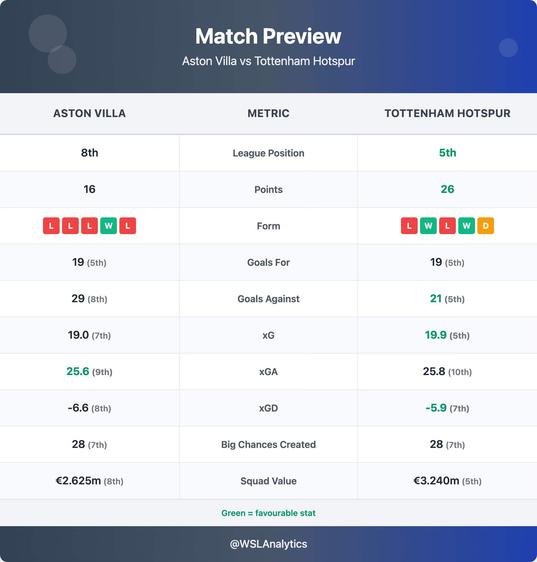 Aston Villa's season is drifting in the wrong direction. Natalia Arroyo's side have lost four of their last five WSL matches, conceding 10 goals across their three most recent defeats alone – to Manchester United (1–4), Everton (1–2) and Liverpool (1–4). They sit eighth on 16 points – enough breathing room from the relegation playoff for now, but not enough to relax. They must treat this as a must-win as a loss will certainly signal a crisis.
