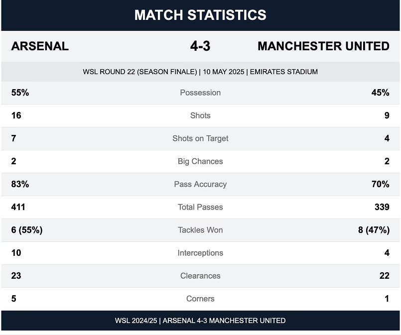 Arsenal ended their WSL campaign by securing the coveted second-place finish in a pulsating season finale against Manchester United. With only one point separating the sides before kick-off and the prize of direct Champions League qualification at stake, the Gunners delivered a performance of attacking quality that overcame their recent defensive frailties.