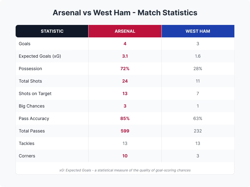 Efficiency Gap: West Ham's shot conversion rate (27.3%) exceeded Arsenal's (16.7%)