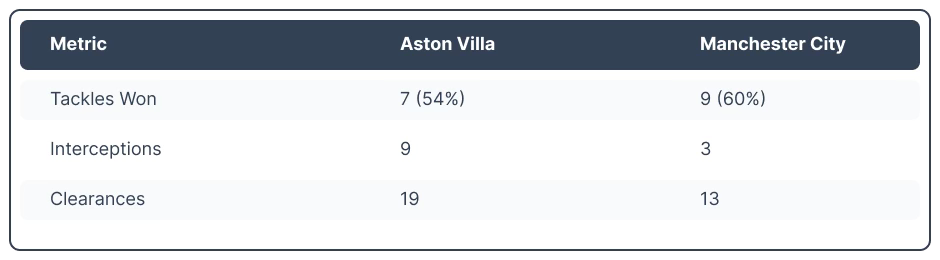 Villa’s 19 clearances and 9 interceptions illustrate how often they were forced into reactive defending. City’s pressing and control limited Villa’s ability to build attacks.