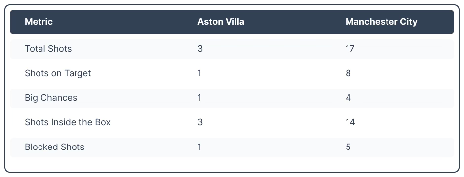 City’s 14 shots inside the box to Villa’s 3 capture the stark difference in attacking threat—explaining why City secured all three points.