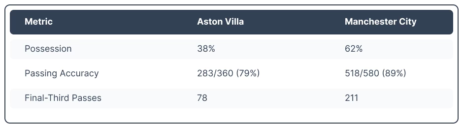 City dominated possession (62%) and passing accuracy (89%), highlighting their control. Their staggering 211 final-third passes (compared to Villa’s 78) show how they consistently probed Villa’s defensive lines.