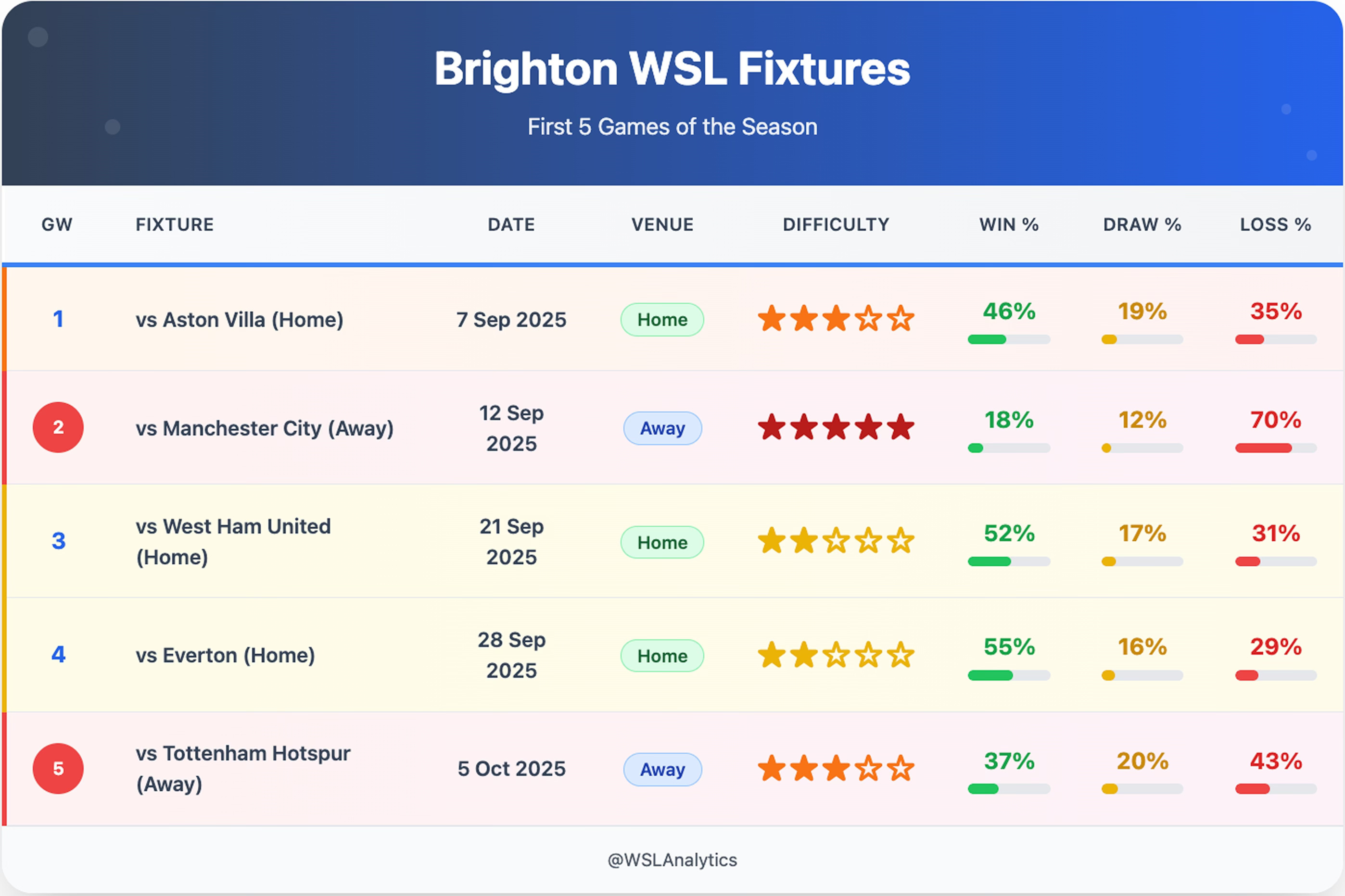 Based on difficulty ratings and win probabilities, a realistic outcome for Brighton's opening five games would be: two wins (vs West Ham, vs Everton), two draws (vs Aston Villa, @ Tottenham), and one loss (@ Manchester City).