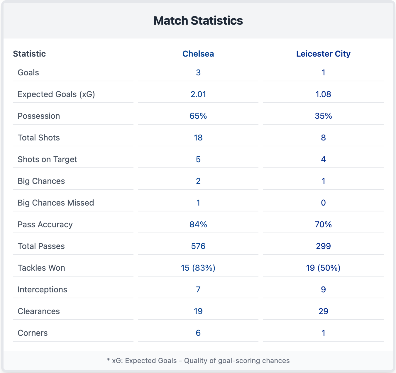 Defensive Resilience: Despite Leicester's organised defence (29 clearances), Chelsea's attacking quality ultimately prevailed