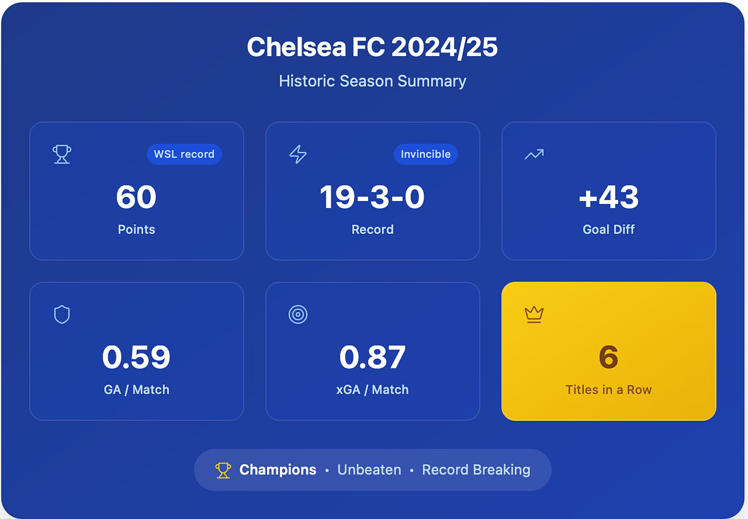 Chelsea's 60 points set a WSL record (maximizing all but 6 possible points) and put them 12 points clear of second-place Arsenal. They amassed a +43 goal difference (56 goals for, 13 against) and a +28.9 expected goal difference (xGD), reflecting balanced excellence in attack and defense. Overall, Chelsea also completed a domestic treble, adding the Subway Women’s League Cup (won 26 March 2025) to the league title and FA Cup on 18 May 2025.