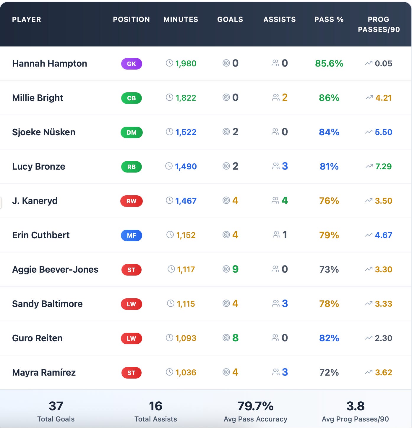 Though she logged just over 1,100 minutes, Baltimore packed elite impact into her time: 3.9 SCA per 90, +2.5 G−xG overperformance, and a brace in the FA Cup Final. Her 54 progressive carries and 7 GCA ranked near the top despite reduced minutes. She gave Chelsea a different dimension on the left and showed up in their biggest moments — few were more explosive.