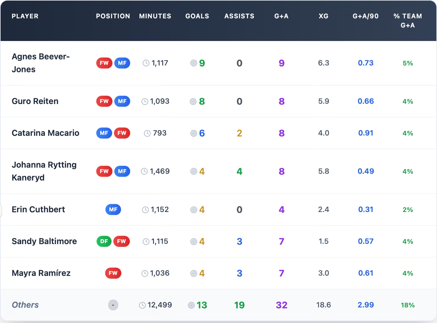 Macario’s league minutes were 793, so her per-90 output benefits from a smaller sample, but she still tops the chart among anyone with meaningful time.