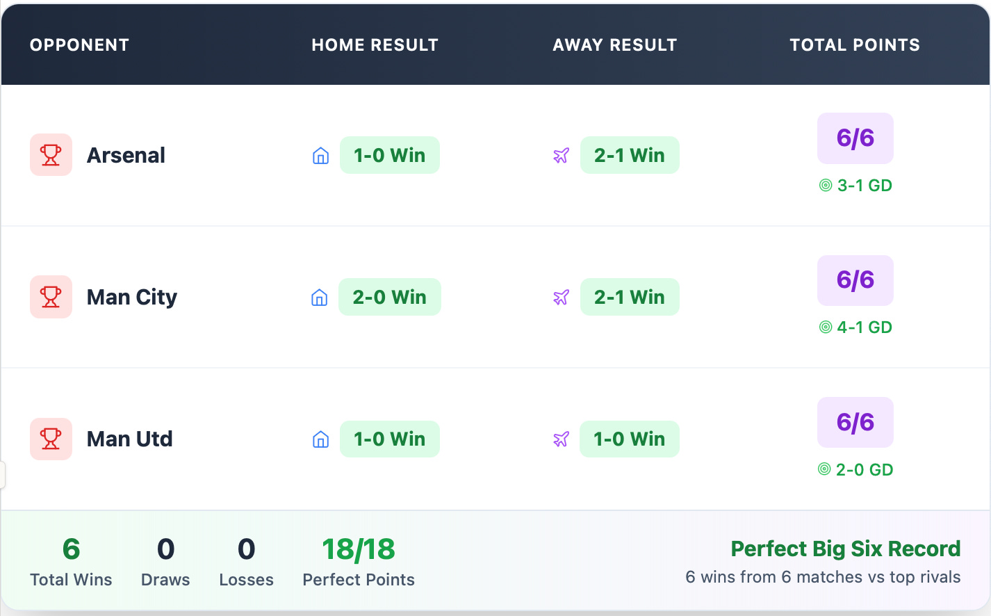 Perfect 6-0-0 record against title rivals (Arsenal, Man City, Man Utd)