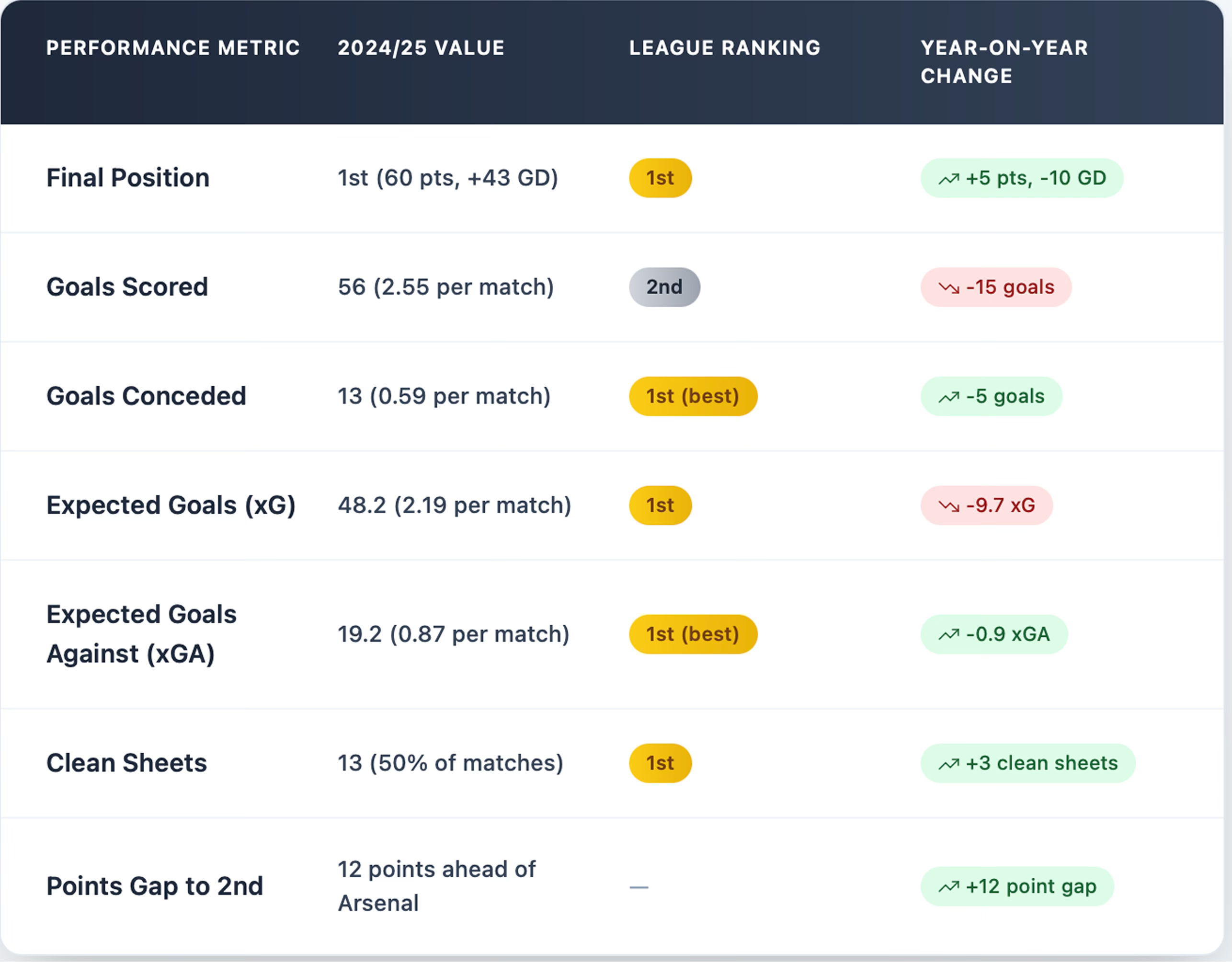 But it was their defence that truly powered the title. Chelsea conceded just 0.59 goals per game (13 in total) — the best in the league — while allowing only 0.87 xGA per match. Hannah Hampton led from the back with 13 clean sheets and +2.1 goals saved above expected. The Blues ended the season unbeaten, finishing 12 points clear of Arsenal and clinching the league with a steely, balanced approach.