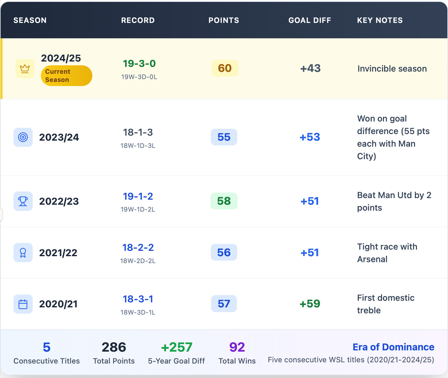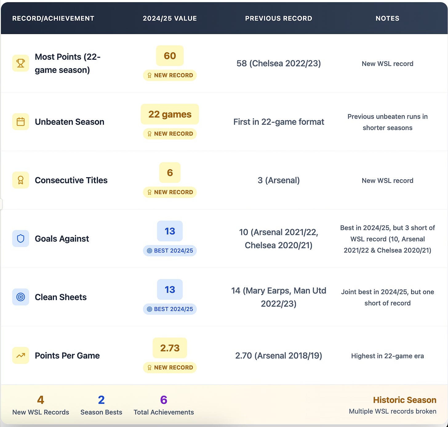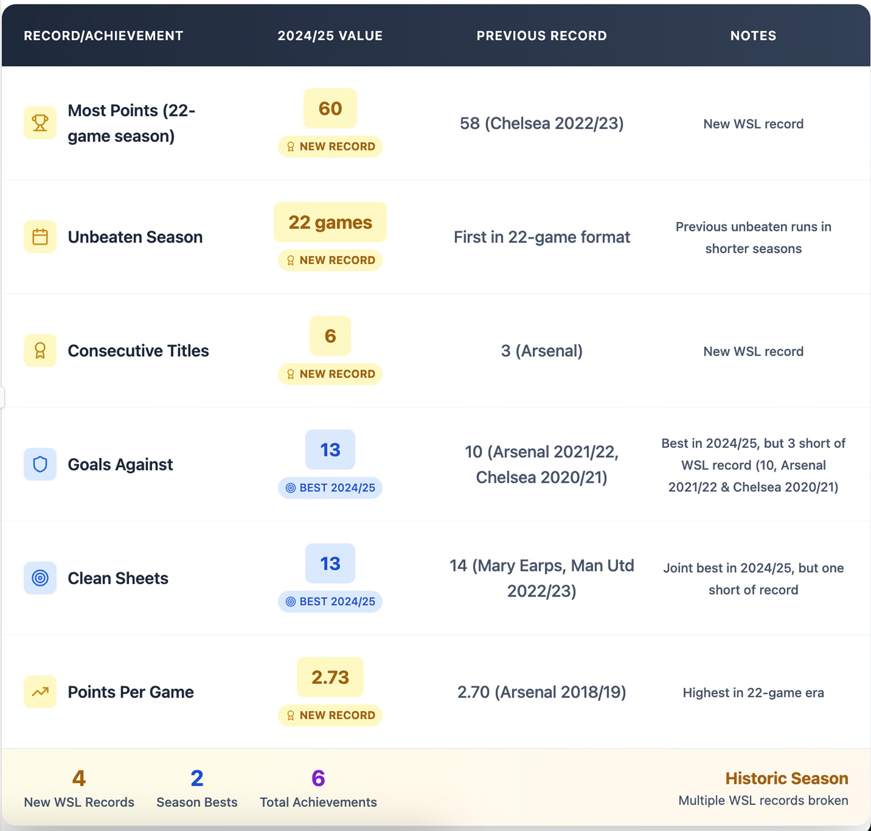 Chelsea’s 2024/25 season wasn’t just title-winning — it was record-breaking. Their 60 points (2.73 per game) set a new WSL benchmark for a 22-game season, part of an unbeaten campaign unmatched in the league’s current format. It marked a sixth consecutive title, doubling the previous record, and confirmed a five-year dominance that included three seasons with 58+ points. While they narrowly missed the all-time defensive records for goals against and clean sheets, their campaign still delivered the league’s best defence and the highest points-per-game average in WSL history.