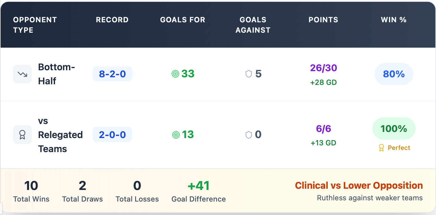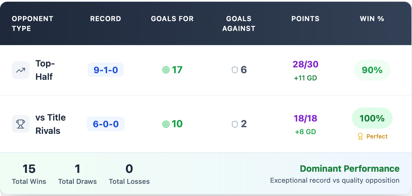 Chelsea’s flawless record against their three title rivals — Arsenal, Manchester City, and Manchester United — was the defining factor in the title race. They took maximum points (18/18) from those six head-to-heads, winning every match home and away and conceding just two goals in total. That alone created a swing large enough to neutralise any slip-ups elsewhere. Beyond that, they also posted a 90% win rate against all top-half teams (28/30 points) — a dominance that ensured the title never truly left their grip.