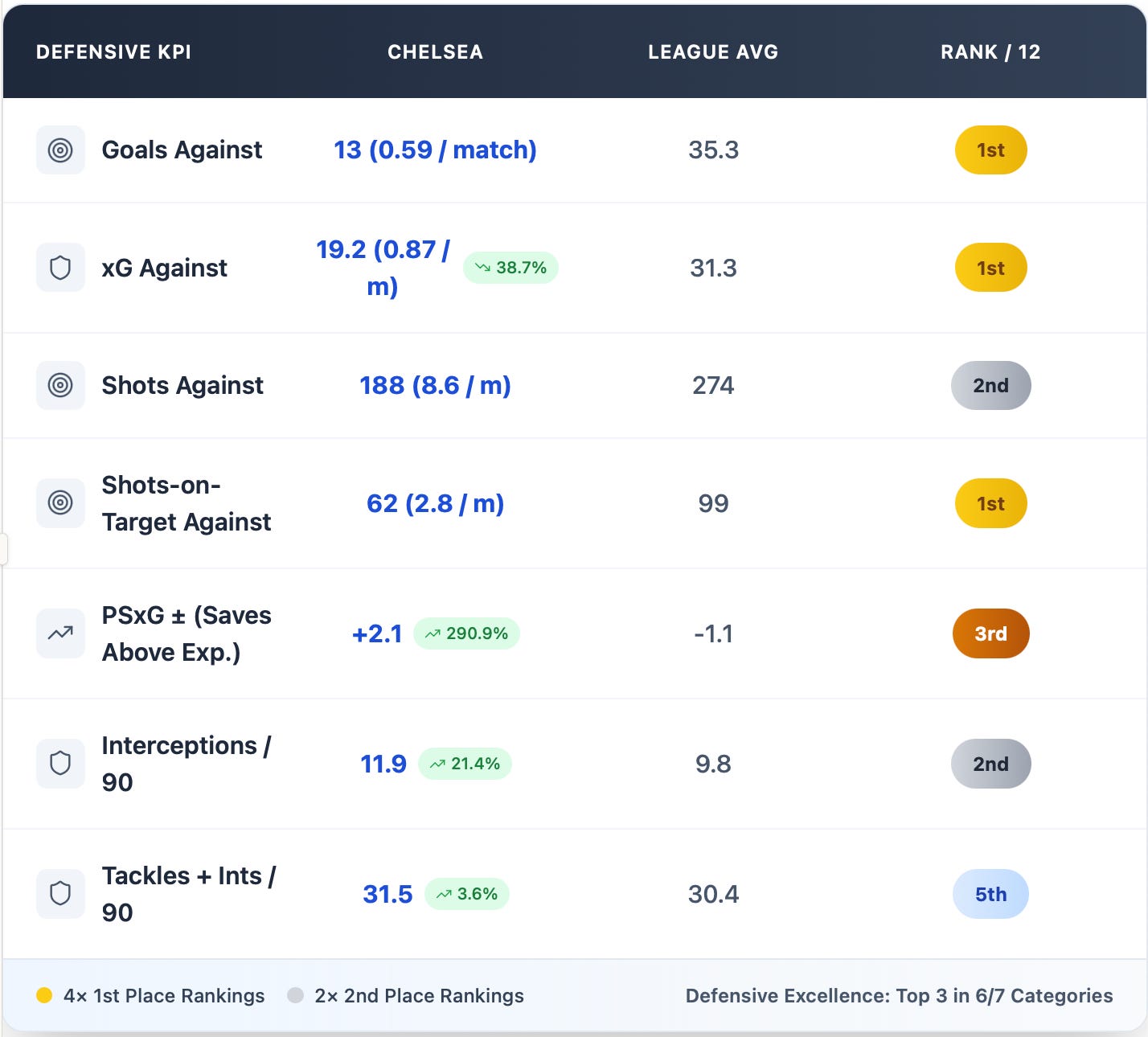 Chelsea's defense was exceptional – arguably the true foundation of their invincible season. They conceded only 13 goals in 22 matches, the fewest in the league, and 5 fewer than previous season.