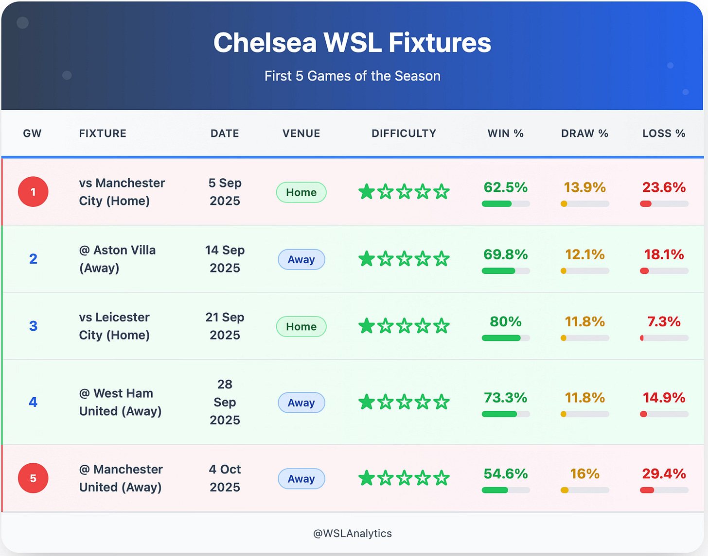 We leverage Elo-based difficulty ratings, head-to-head records, squad valuations, and recent form to preview Chelsea's first five WSL matches in detail.