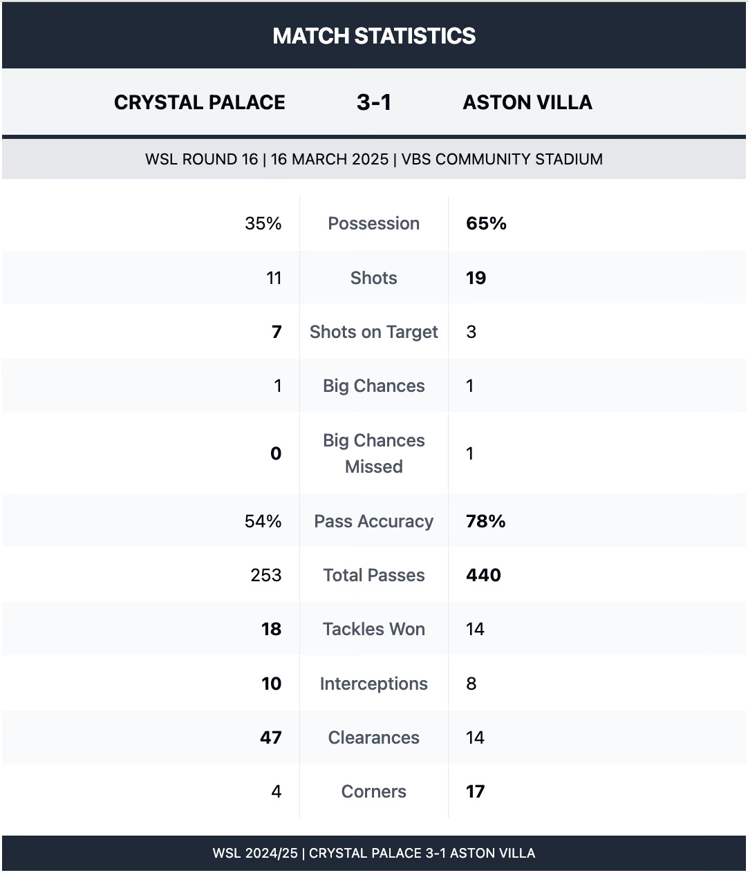 The match opened up significantly after the break, with Palace doubling their lead in the 53rd minute through Ashleigh Weerden, assisted by Katie Stengel. Villa responded by making a quadruple substitution and gradually built pressure, creating several opportunities from their 13 second-half corners. Lucy Parker eventually reduced the deficit in the 85th minute, but any hopes of a late comeback were extinguished when Stengel capped a stellar individual performance with a goal in the fifth minute of stoppage time, pouncing on a poor error from Villa goalkeeper Sabrina D'Angelo.