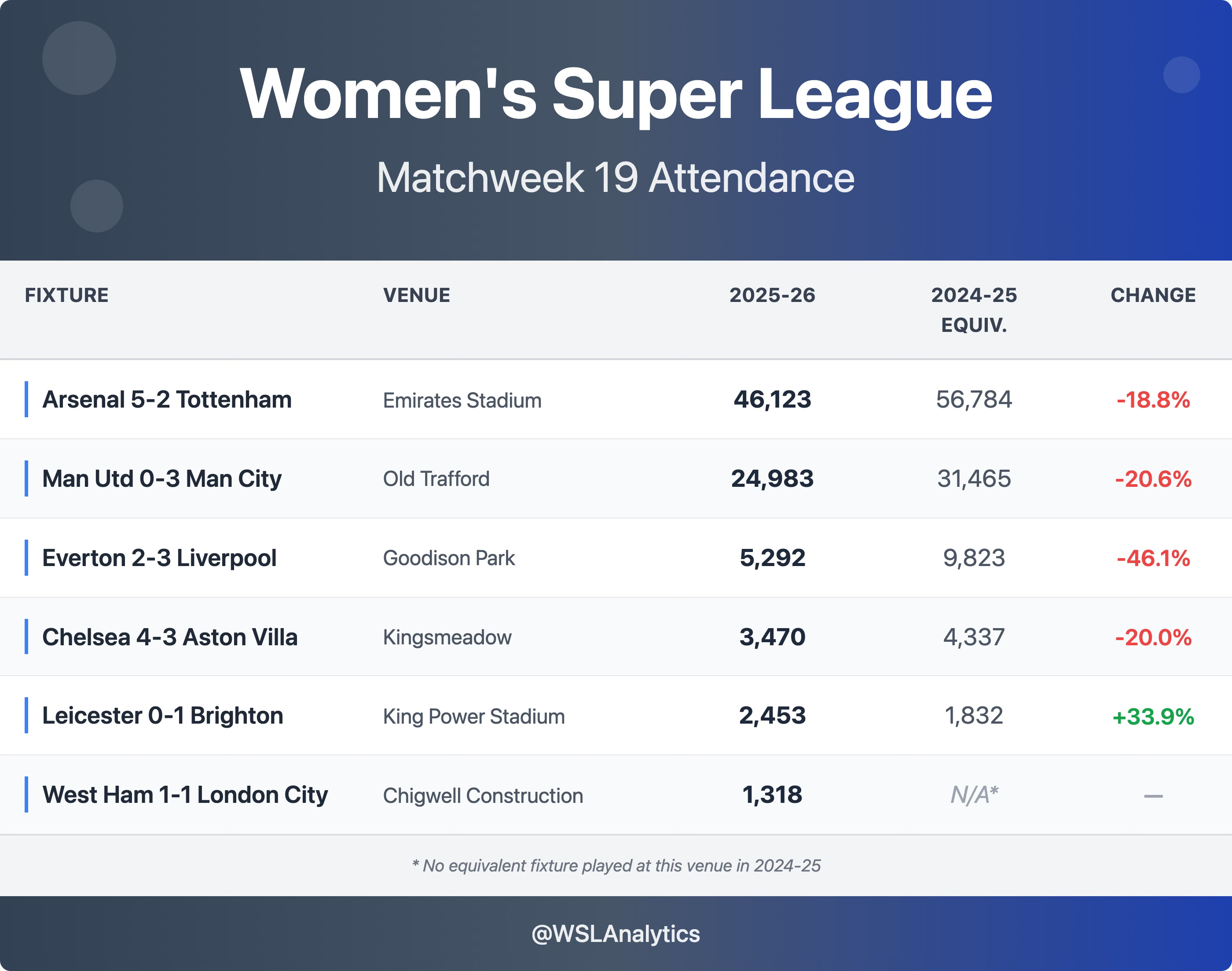 The North London Derby lost nearly 11,000 fans. Arsenal vs Tottenham at the Emirates drew 46,123 — a strong crowd by any measure, but down from 56,784 for the same fixture last season. That’s a drop of more than 10,600 for the WSL’s marquee rivalry, and part of a broader pattern this season.