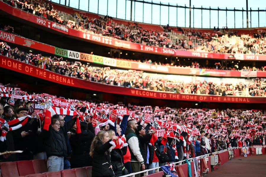 Strip out the Emirates and the aggregate drops to 37,516 across five fixtures — an average of 7,503. Strip out Old Trafford as well and the remaining four games averaged 3,133.