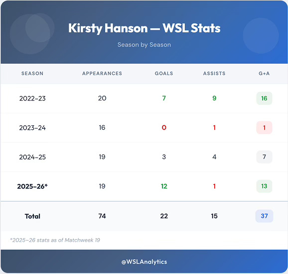 She’s the WSL’s most clinical finisher, she accounts for nearly half of Aston Villa’s goals, and she’s doing it all from mid-table. Kirsty Hanson’s 2025–26 campaign is one of the stories of the season