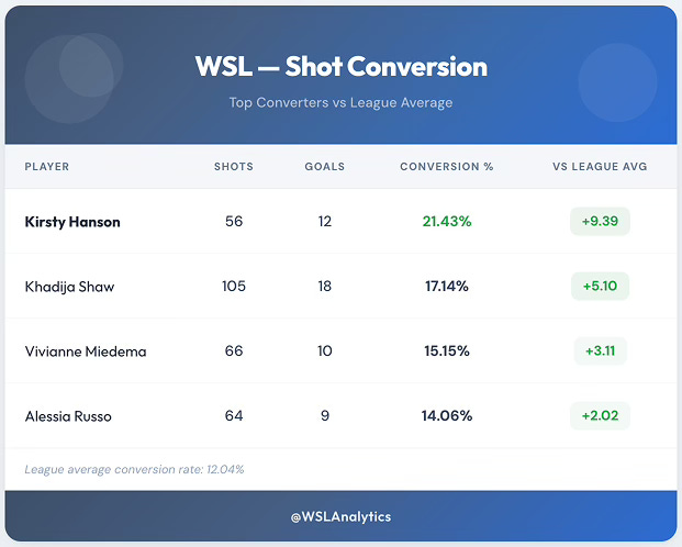 The shot conversion data reinforces this even further. The league average conversion rate this season is 12.04%. Hanson is converting at 21.43% – nearly double – from 56 shots. That’s the highest rate among the WSL’s leading scorers, and it’s not particularly close: