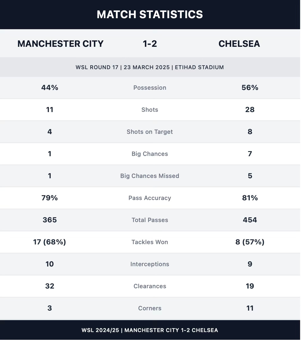 Manchester City 1-2 Chelsea Stats: Chelsea Claim Dramatic Late Victory in WSL Title Showdown
