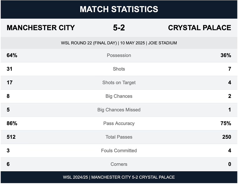 For City, this victory provides a positive ending to a somewhat disappointing season where they fell short of title contention and a European place. For Palace, despite the defeat, moments of quality offer some encouragement as they prepare for life in the Championship next season and a potential future return to the WSL.