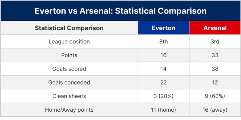 Breaking down the numbers: The stats underscore Arsenal’s dominance in both attack and defence, but Everton’s strong home form remains a key factor. The Toffees’ ability to grind out results at Walton Hall Park (11 points at home) suggests they could make this a closer contest than the league standings imply.