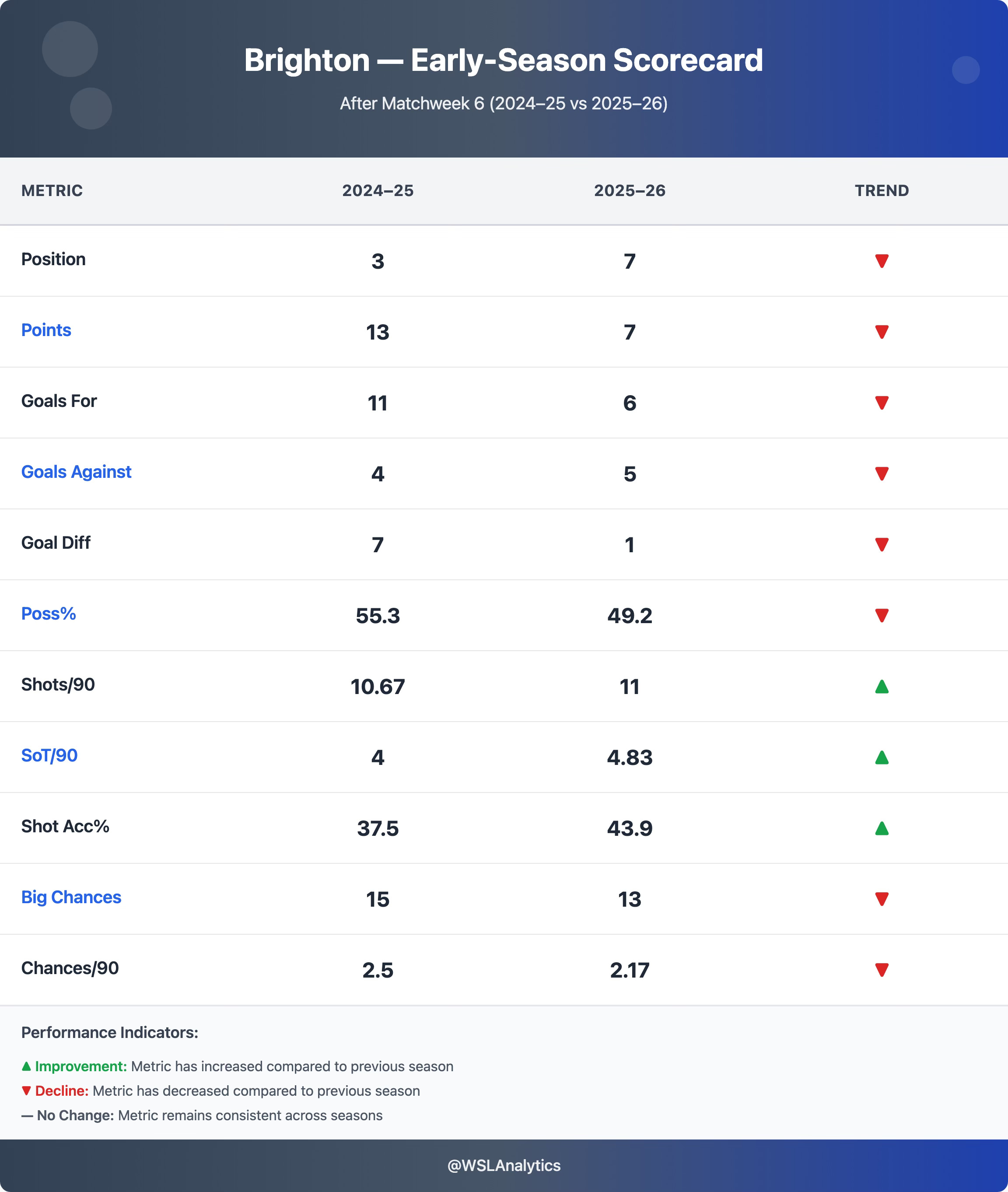 - Scoreboard slide. Brighton’s bright start from last season hasn’t carried over: they have seven points from six matches (two wins, one draw, three losses), down from 13 at this stage last season. Goals scored have dropped from 11 to 6, while goals conceded have risen marginally from 4 to 5, trimming their goal difference from +7 to +1.
