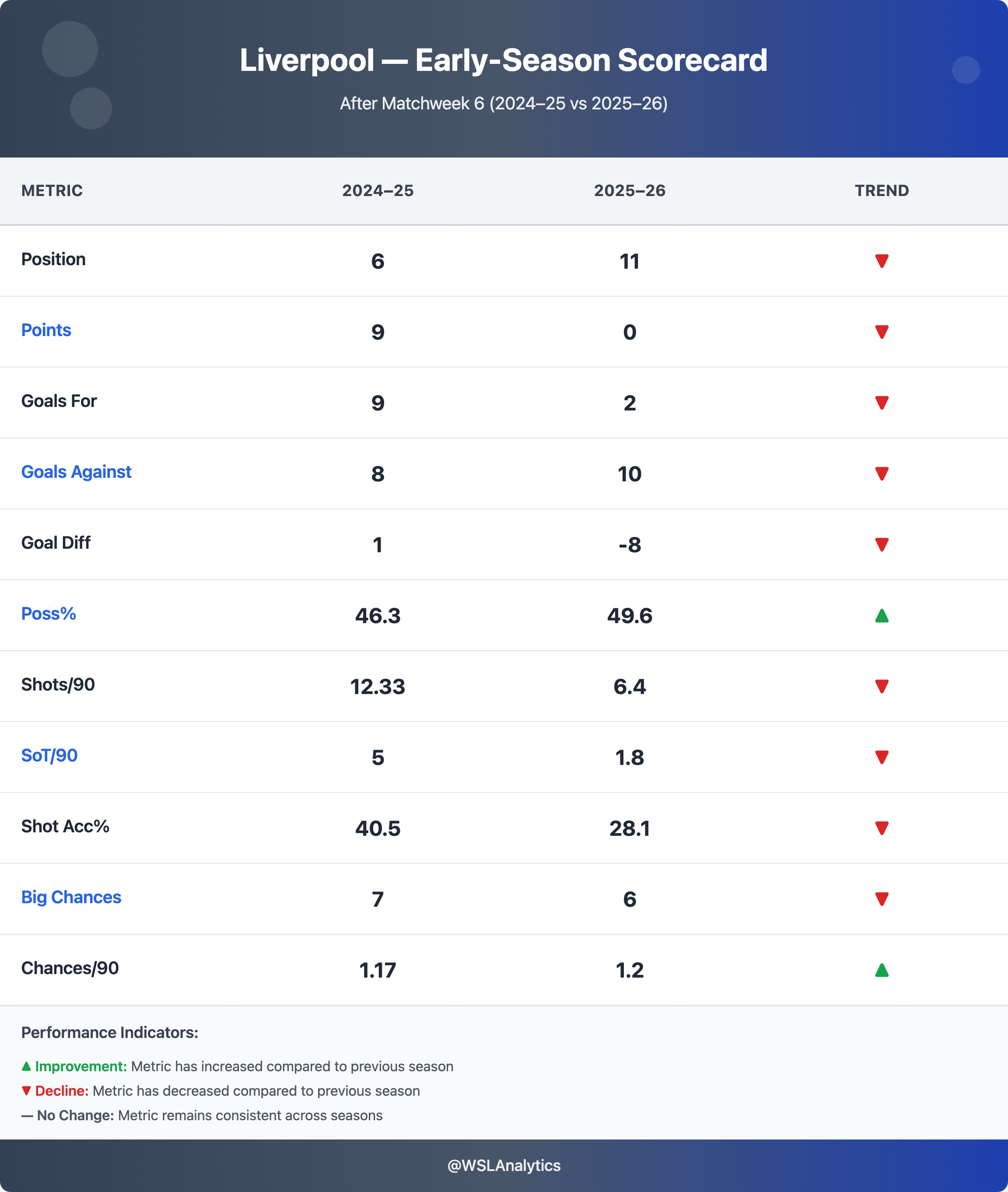 - Attacking collapse. The Reds are averaging just 6.4 shots per game, less than half last year’s output of over 12, and their shot accuracy has dropped from 40.5% to 28.1%. They’ve created only six big chances across their matches, reflecting a clear shortage of final-third productivity. Their possession share has actually risen to 49.6%, but most of it has been sterile – ball control without penetration.
