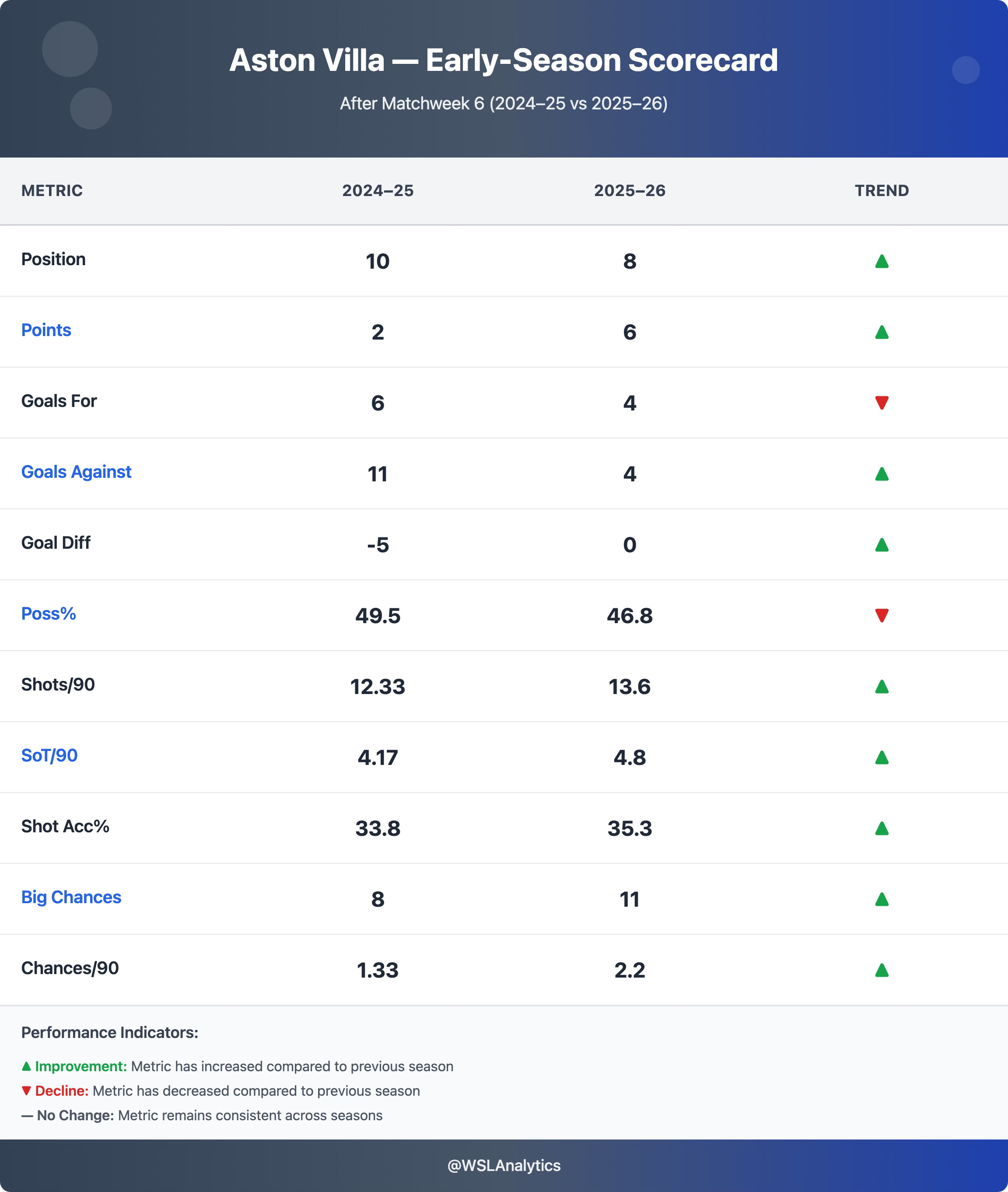 - Marked improvement. Aston Villa have made clear progress from last season’s sluggish opening. After six games of 2024–25 they had just two points and no wins; this time they have six points from five matches, already tripling last year’s total while playing one game fewer. Their position has improved from tenth to eighth, reflecting a more competitive edge and greater resilience in tight games.