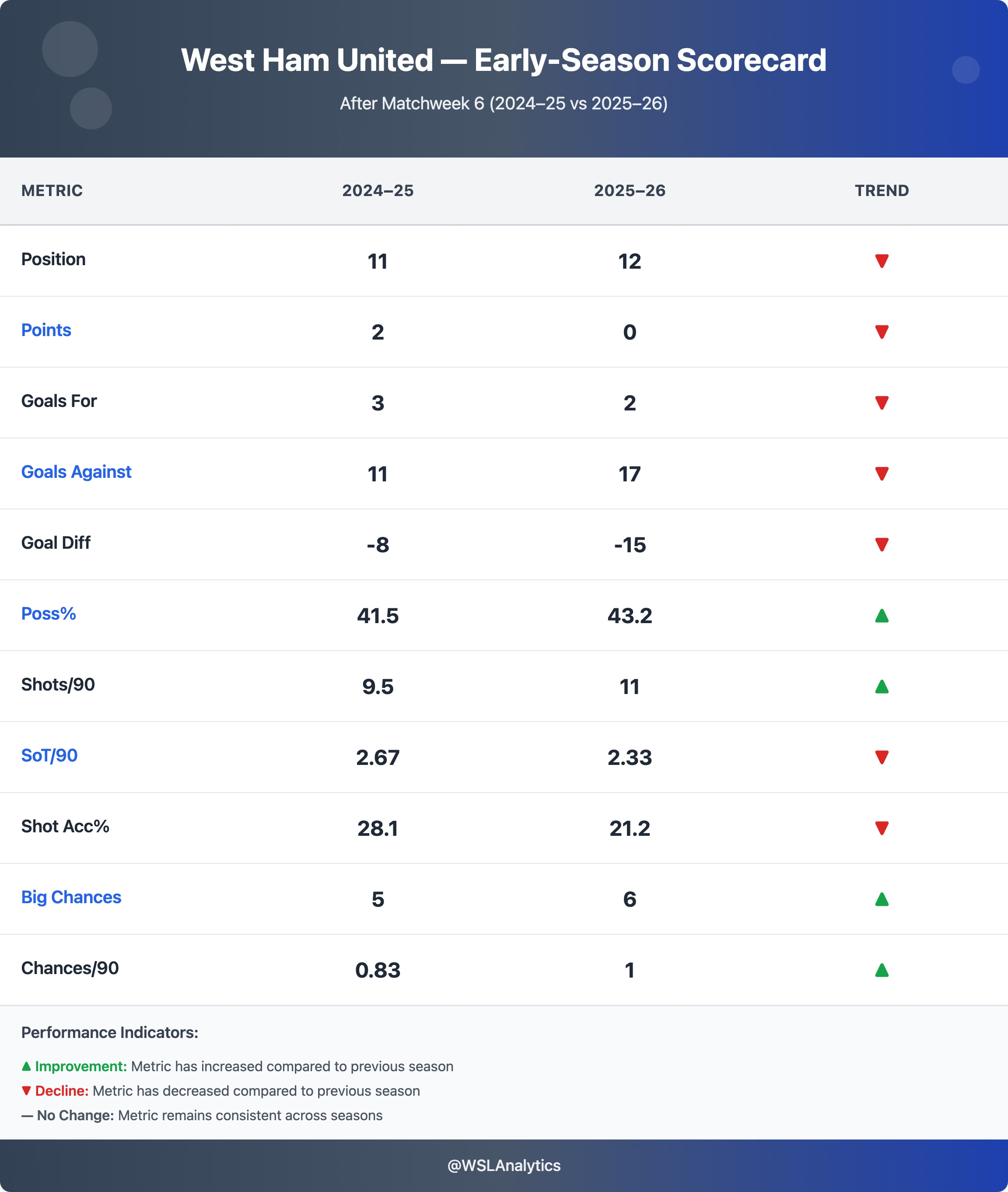 - Bleak start. West Ham have endured a torrid opening to the 2025–26 campaign. Six matches in, they remain without a point and sit bottom of the table, having lost all six games. This is a regression from last season’s slow start, when they at least managed two draws and two points by this stage. Their goal difference has worsened from minus eight to minus fifteen, underlining the scale of the downturn.
