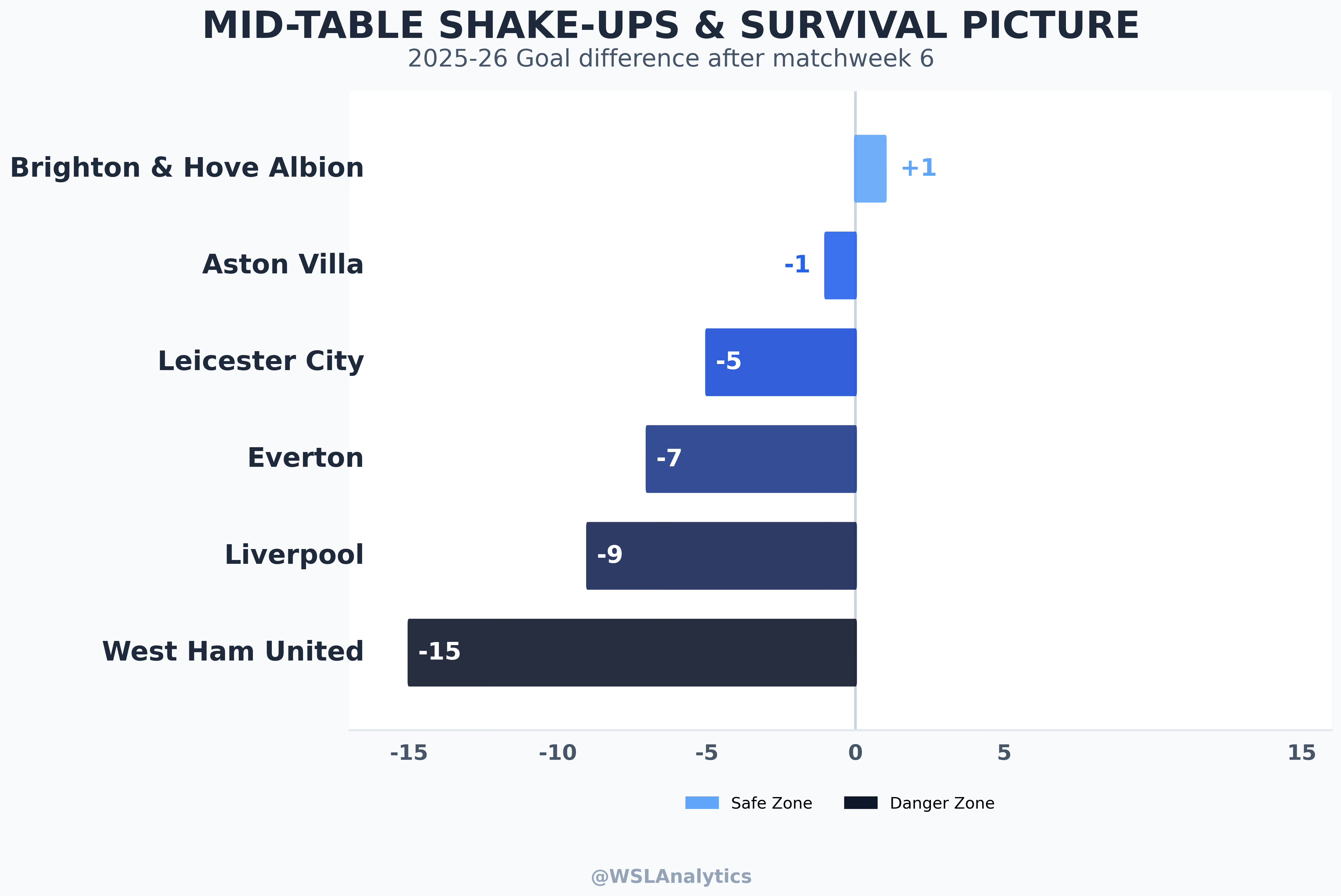 Brighton and Villa show measured stability and renewed defensive discipline; Leicester and Everton hover between promise and limitation; Liverpool and West Ham are precariously on the edge.