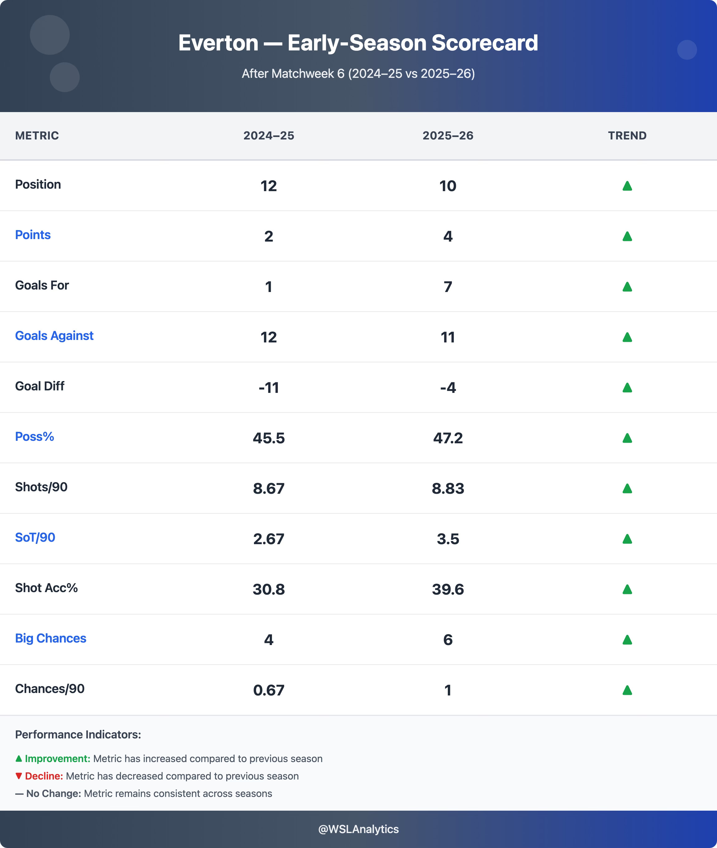 - Modest progress. Everton have taken small but meaningful steps forward after last season’s dismal start. At this stage in 2024–25, they had two points and a single goal to their name; this season they have doubled their points to four and scored seven times. The jump in attacking output is dramatic – a sevenfold increase. It is important though to note 57% of those 7 goals came from one match.