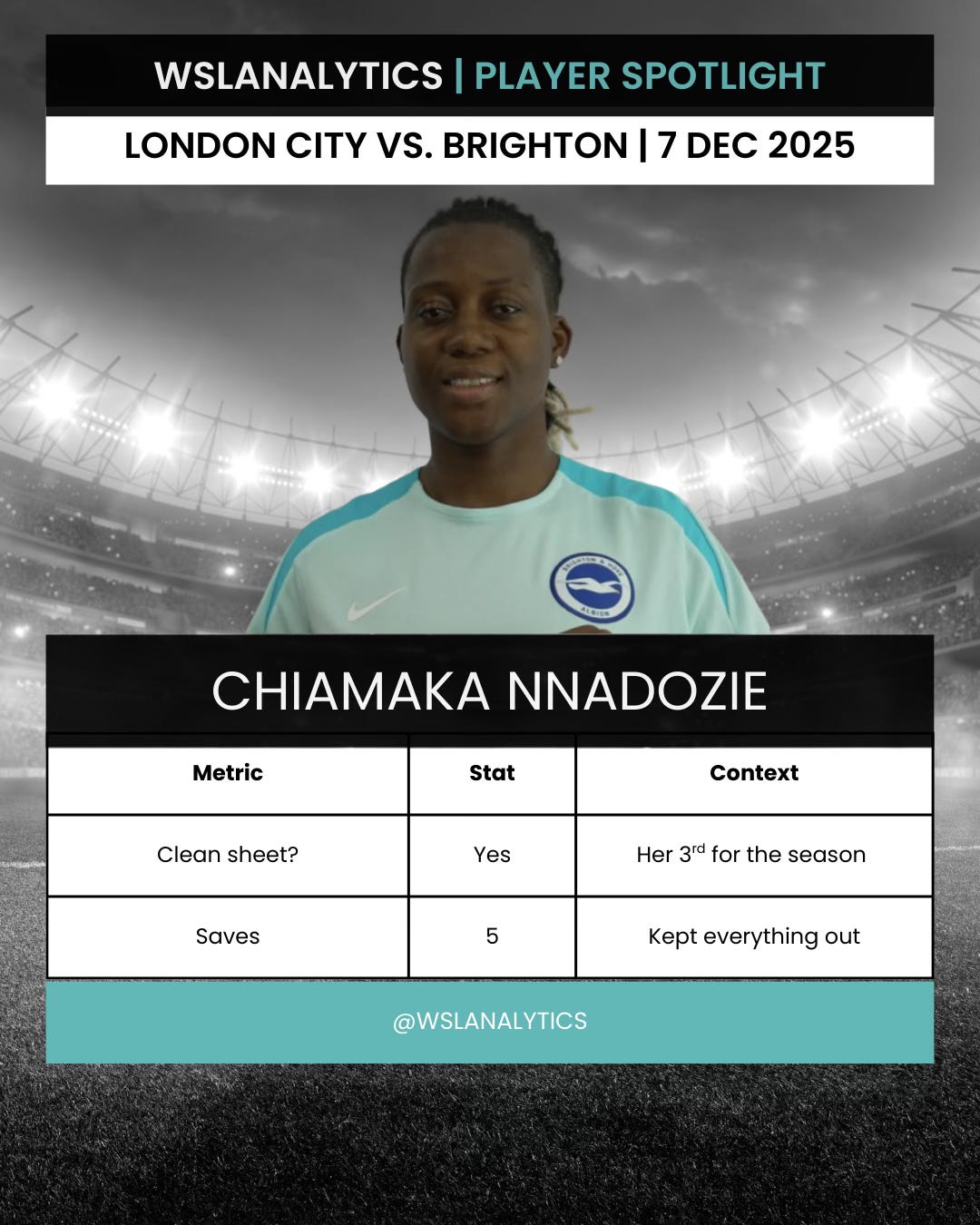 Steadfast Seagulls defence: Brighton defended stoutly under waves of LCL attacks, racking up 23 clearances and 5 blocks. Keeper Chiamaka Nnadozie was outstanding with 5 saves. LCL won 12 corners but the Seagulls’ well-organised back line ensured the home side could not find a way through.