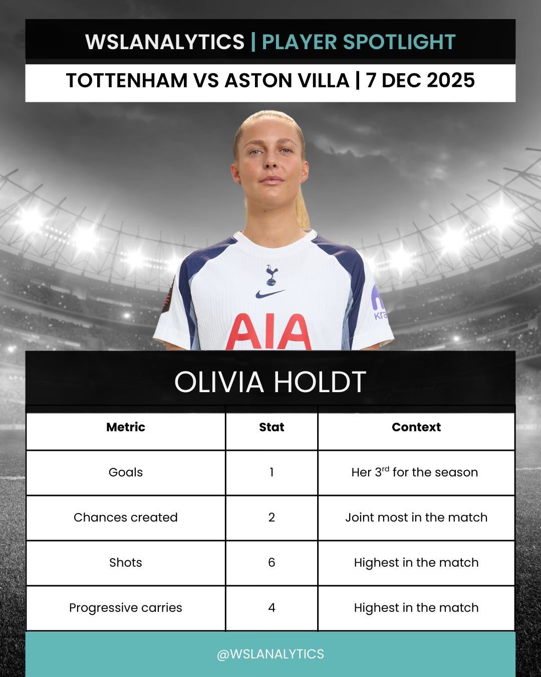 Tottenham struck twice in the final minutes to snatch a dramatic 2–1 victory over Aston Villa. After a cagey contest, Villa grabbed the lead on 84′ through Kirsty Hanson’s strike. Spurs responded immediately as Beth England equalised in the 85th minute, and in stoppage time (90+′) Olivia Holdt fired home the winner from a Drew Spence assist.