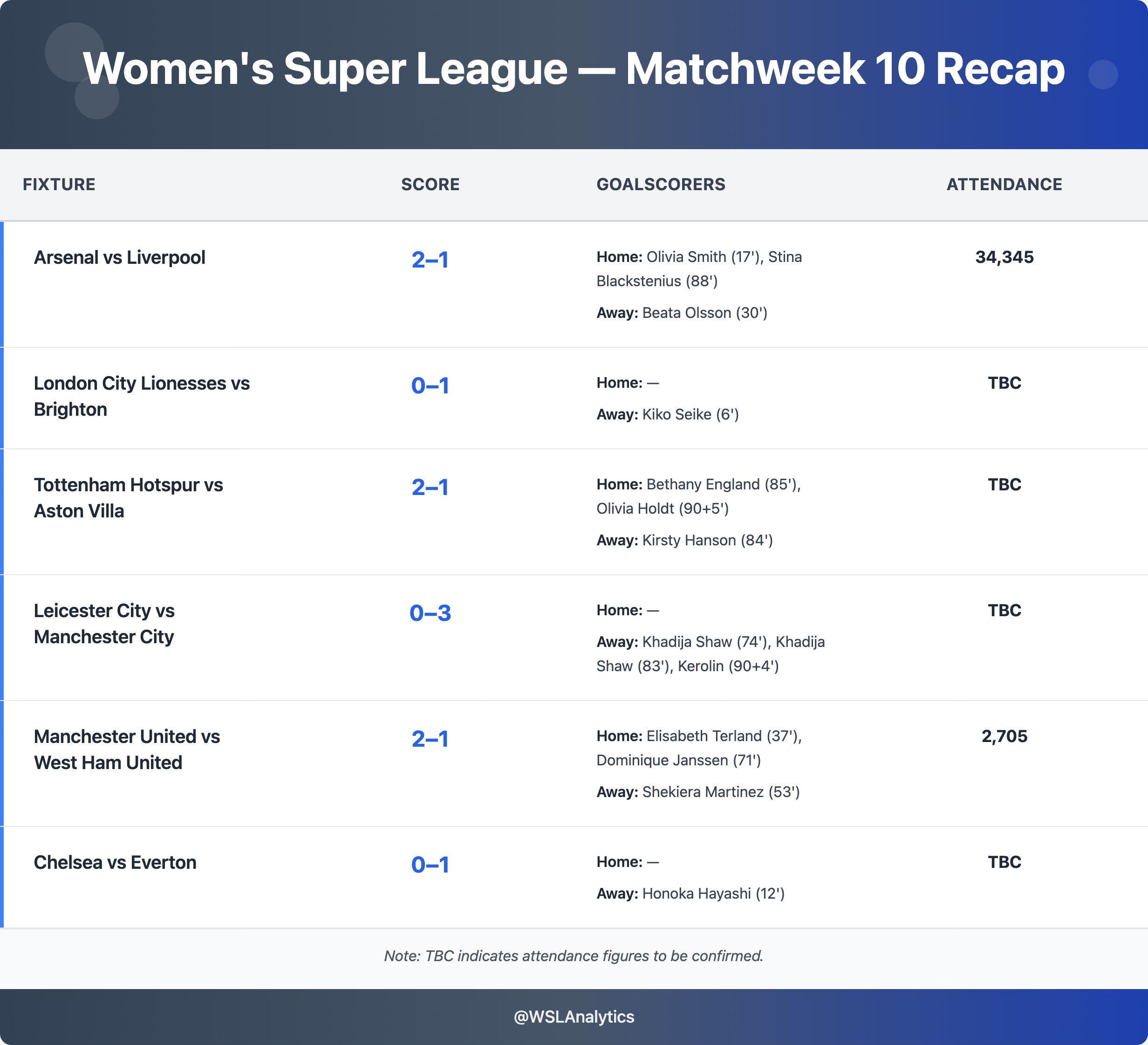 Gameweek 10 produced 14 goals across six fixtures, with every match yielding a winner as the title race took another dramatic turn. Reigning champions Chelsea suffered a stunning 0–1 home defeat to Everton – ending a 34-match, 585-day unbeaten WSL run – allowing Manchester City to strengthen their grip at the top of the table.