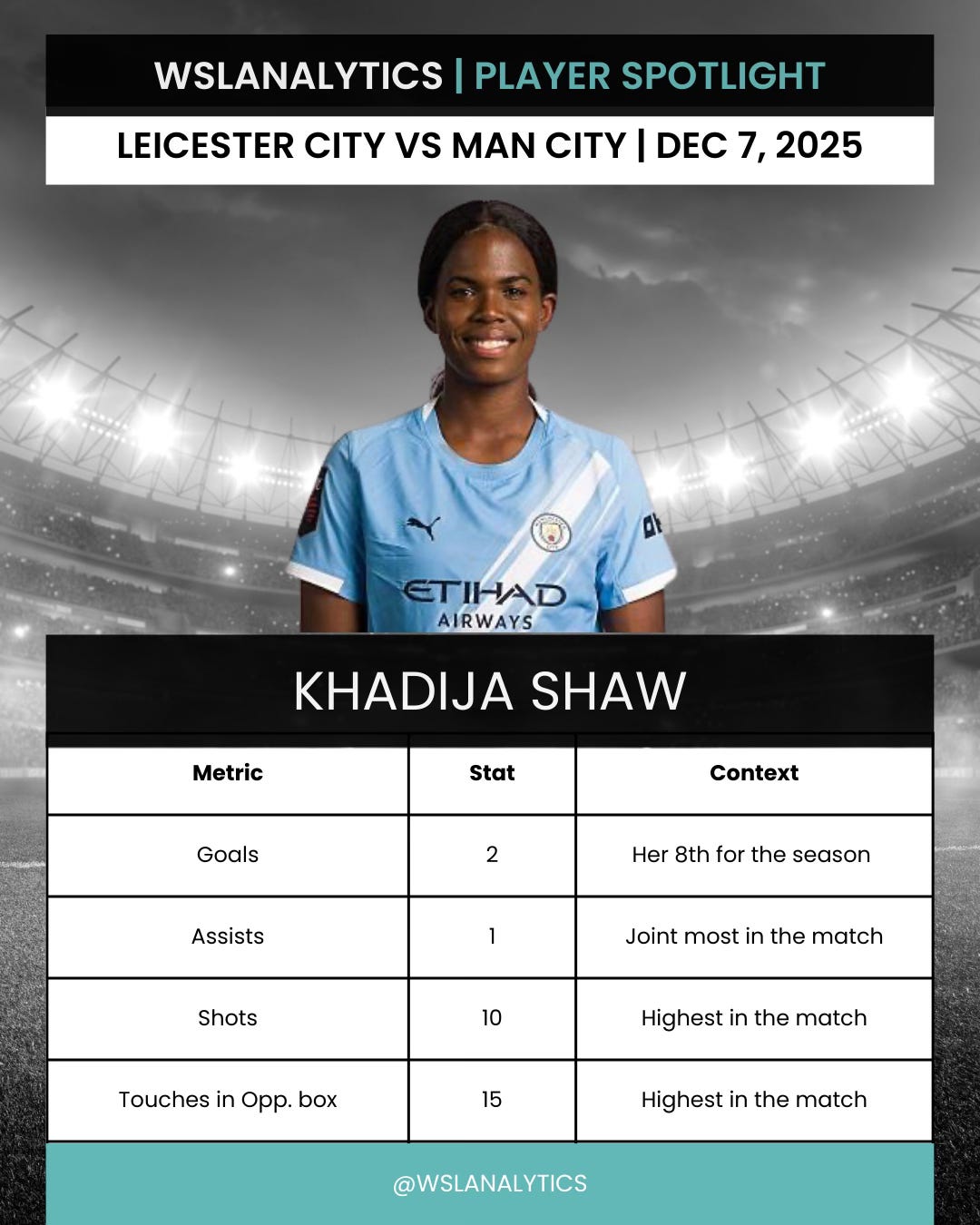 Manchester City eventually overpowered Leicester City 3–0 at King Power after a second-half surge. Despite relentless one-way traffic throughout, the Foxes held out until Khadija Shaw broke the deadlock on 74′ from a Kerolin assist. Shaw doubled the lead in the 83rd minute via Lauren Hemp’s setup, before returning the favour by assisting Kerolin in stoppage time to cap the comfortable win.