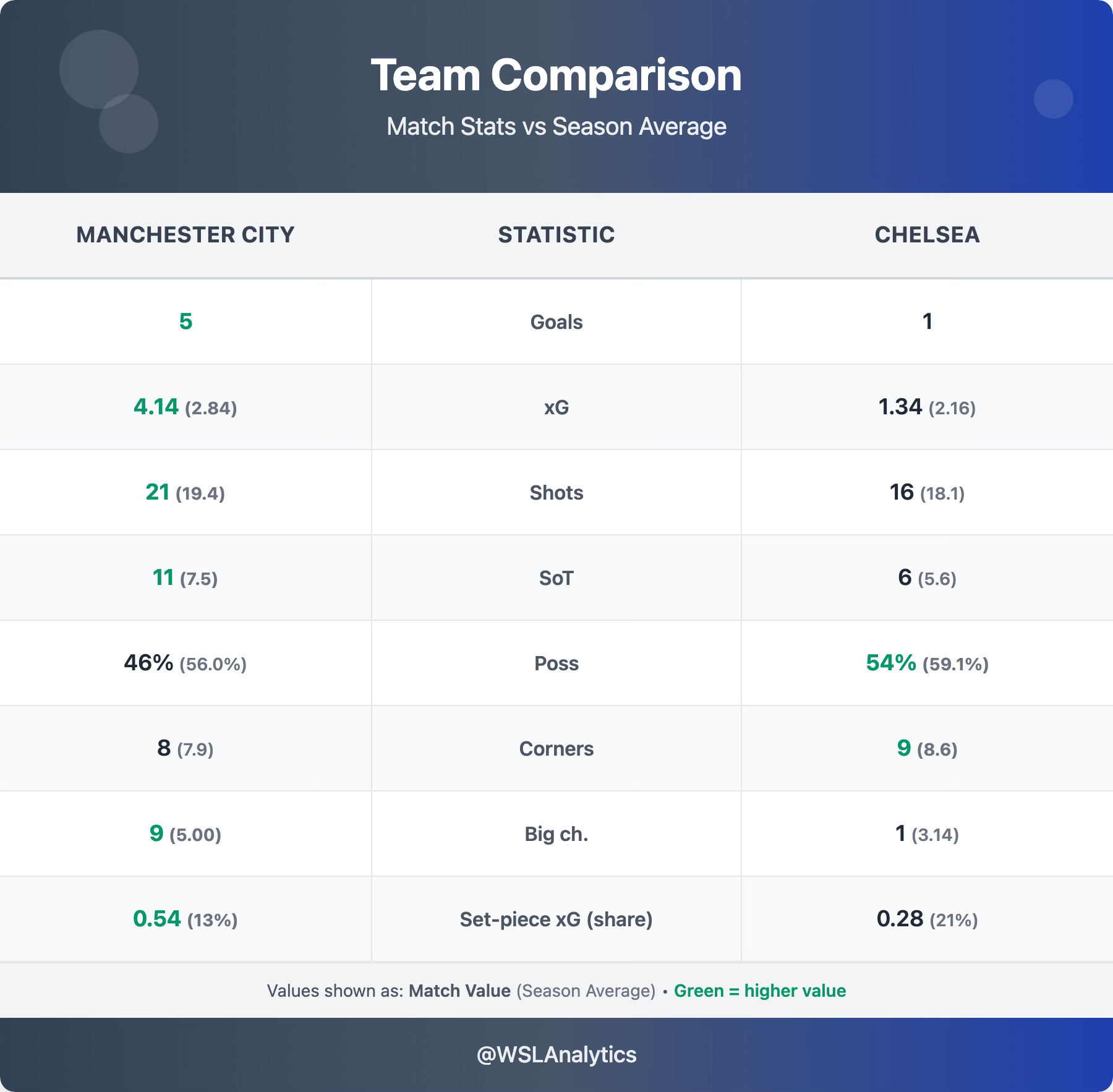 At the other end of the spectrum, Manchester City’s demolition of Chelsea was the purest “numbers match the narrative” performance of the weekend: overwhelming xG, overwhelming shot quality, and a match that felt over, long before the final whistle.
