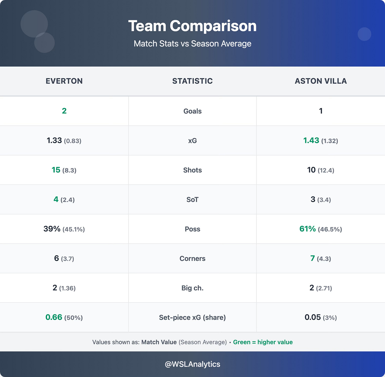 Everton’s attacking output jumped from “season-long survival mode” to “actual threat”: 15 shots versus an 8.3 season average, and 1.33 xG versus 0.83.