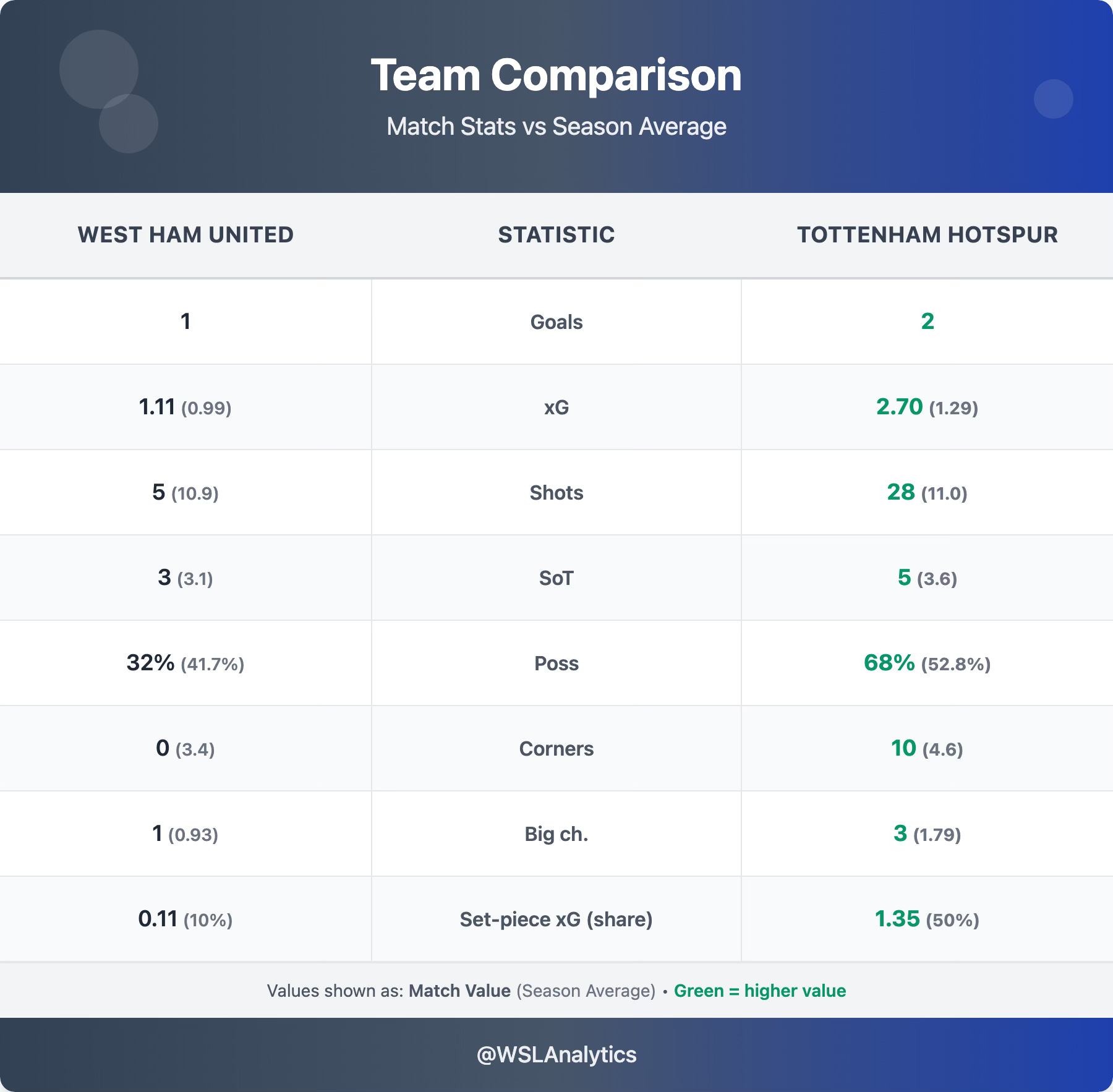 Tottenham’s 28 shots was their highest so far this season and was more than 2.5× their season average (11.0). Their 10 corners more than doubled their typical output (4.6).