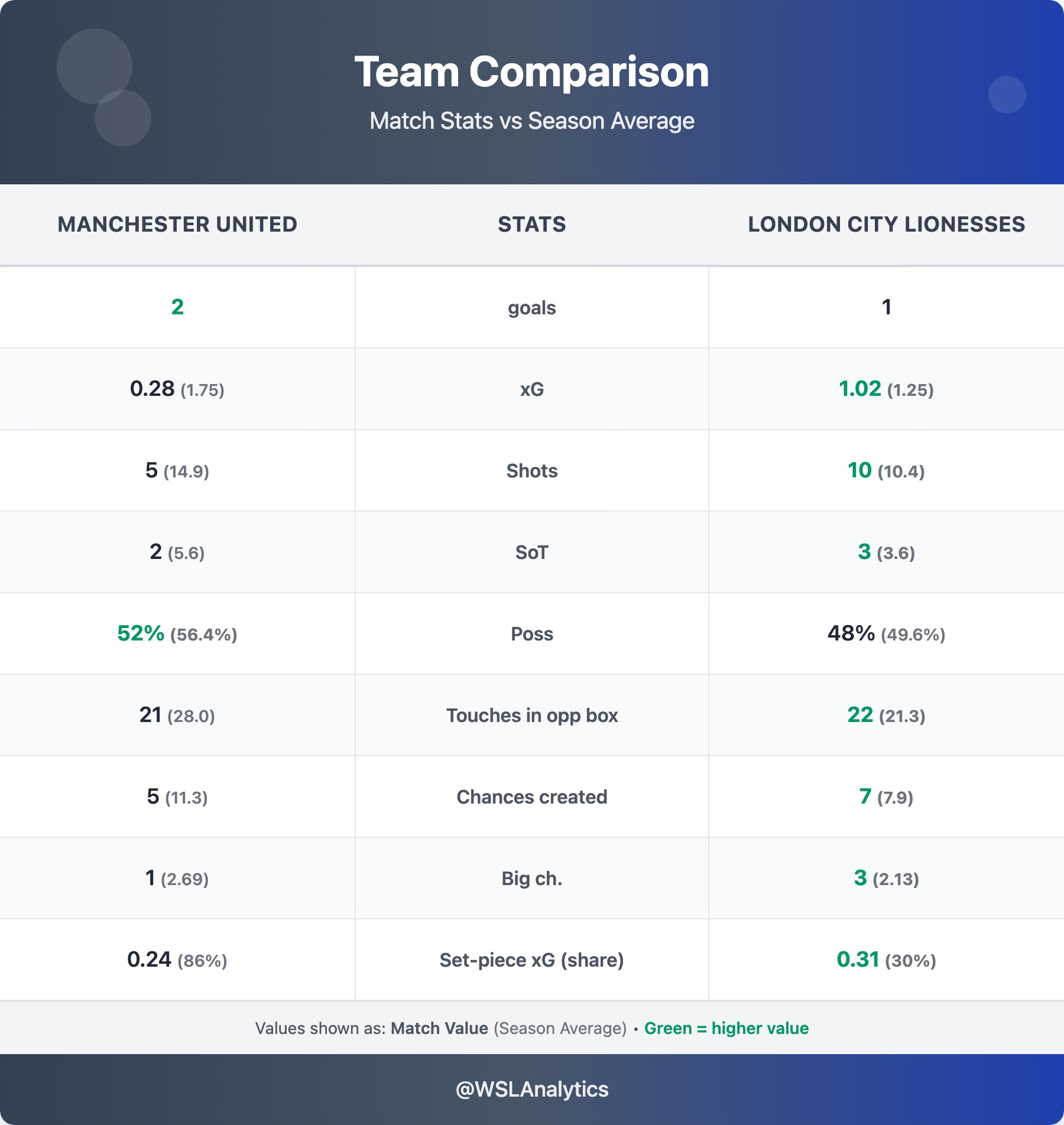 London City Lionesses will feel hard done by. They were competitive in nearly every metric and bettered their season baselines where it mattered – 3 big chances vs a 2.13 average (≈1.4×), 22 touches in the opposition box vs 21.3, and 10 shots roughly in line with their 10.4 norm. Their 1.02 xG significantly outstripped United’s 0.28 – on another day they take something from this game.