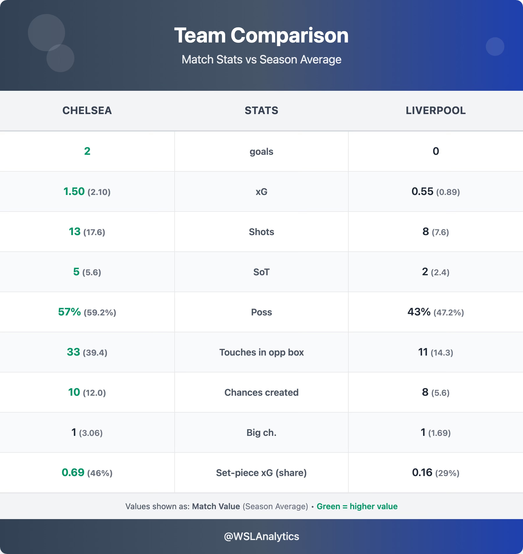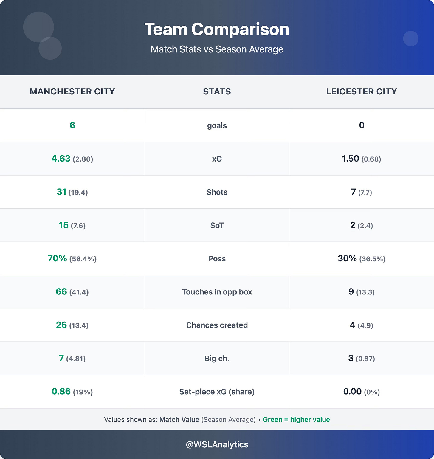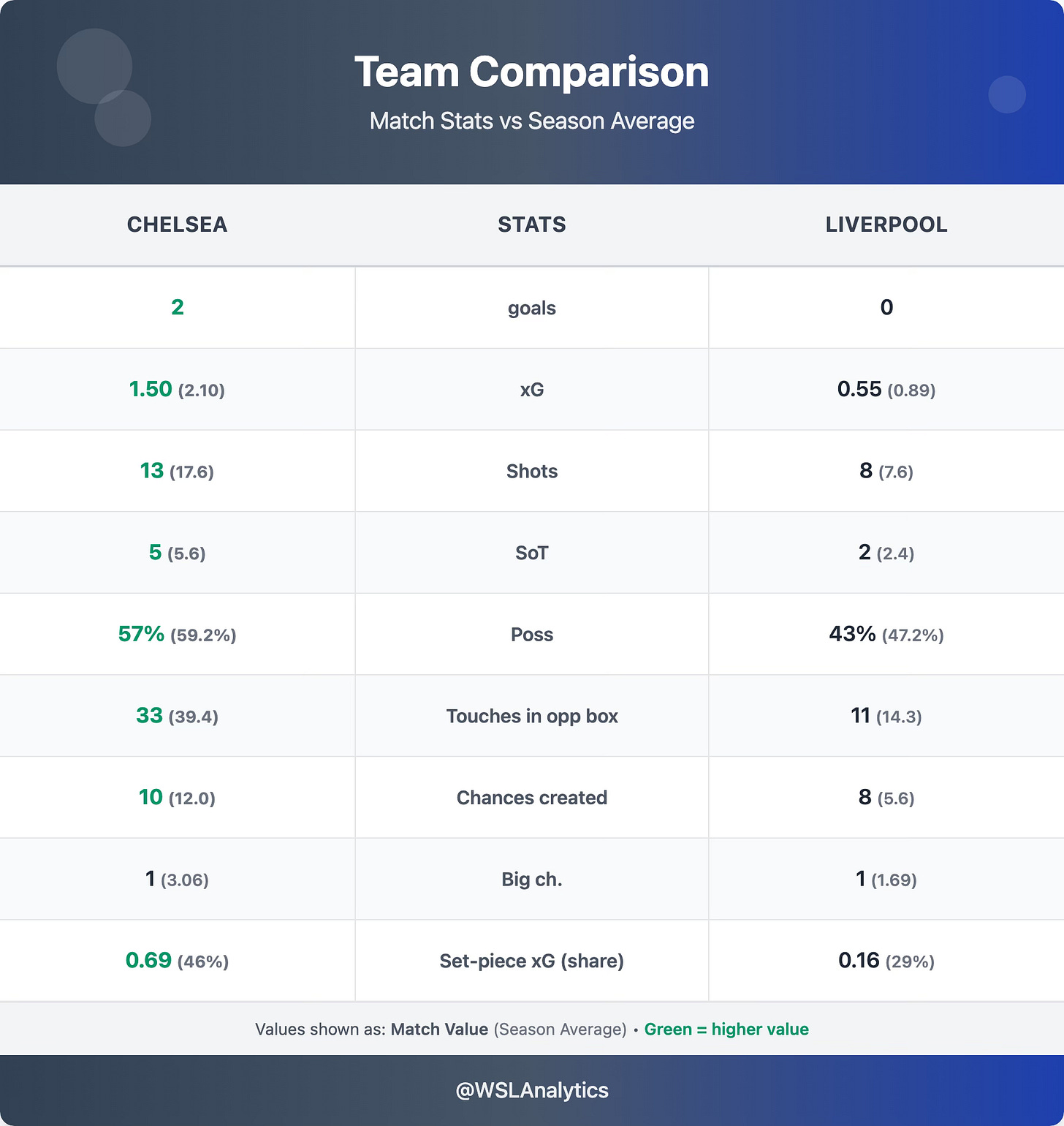 Chelsea won comfortably without reaching their usual levels. They were below season average in almost every attacking metric – 13 shots vs a 17.6 average, 1.50 xG vs 2.10, and just 1 big chance vs a season average of 3.06 (≈3× below). The difference-maker was individual brilliance of Lauren James.