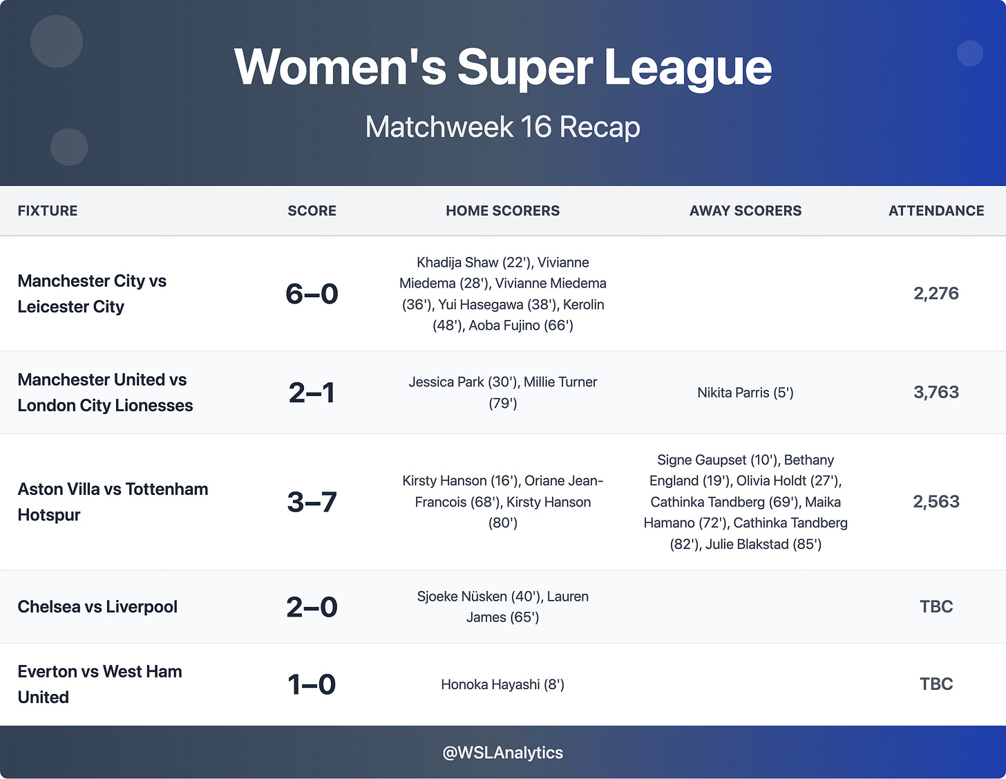 Tottenham ran riot at Villa Park with a stunning seven-goal display to move level on points with Arsenal. Signe Gaupset opened the scoring in the 10th minute before Kirsty Hanson equalised for Villa shortly after. Bethany England and Olivia Holdt then struck to give Spurs a commanding 3–1 half-time lead. The goals kept flowing in a breathless second half, with substitute Cathinka Tandberg netting twice and Maika Hamano and Julie Blakstad both scoring their first Spurs goals to seal a remarkable victory. Hanson and Oriane Jean-François replied for Villa, but it was a chastening afternoon for Natalia Arroyo's side, who have now lost four of their last five.