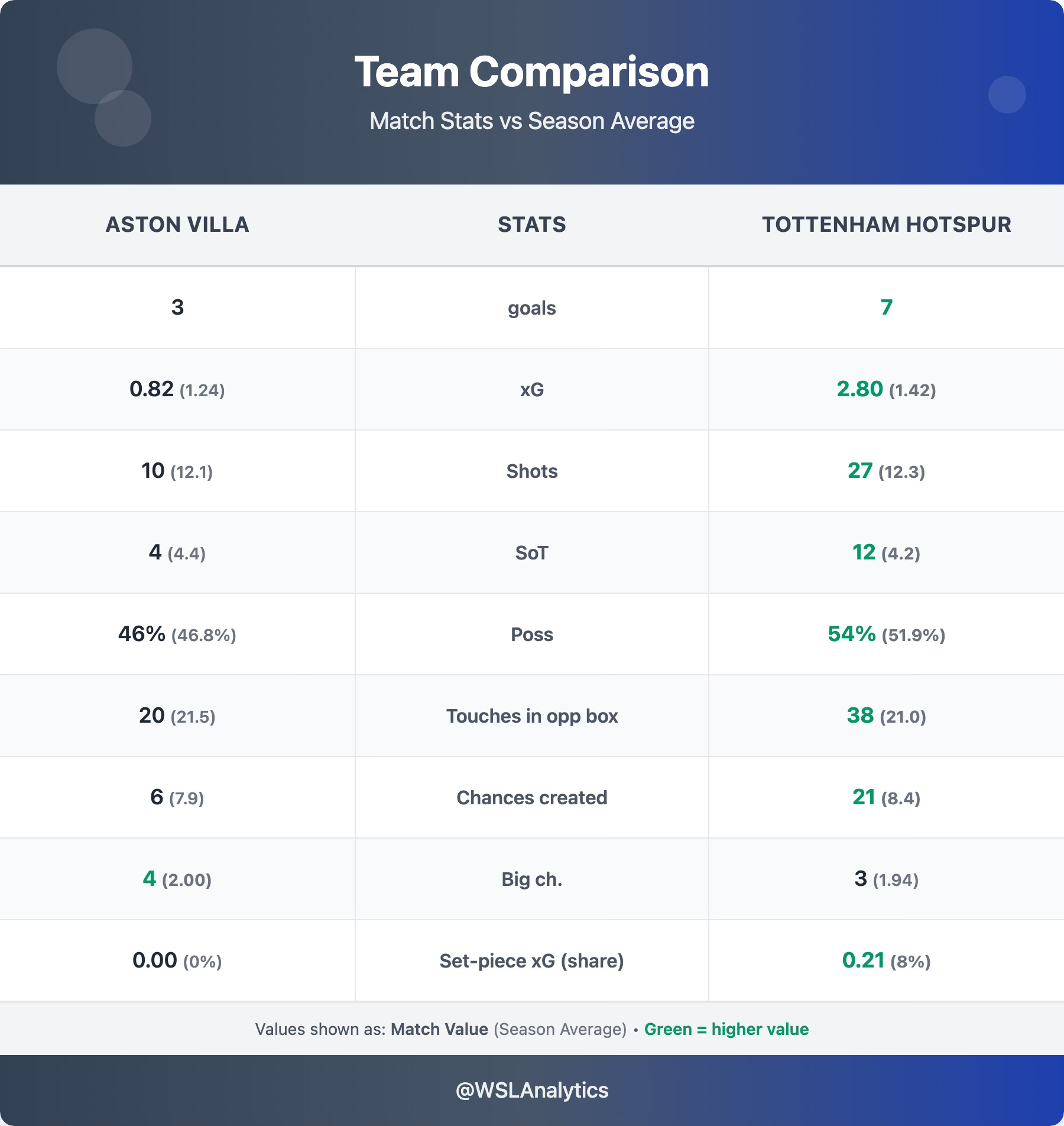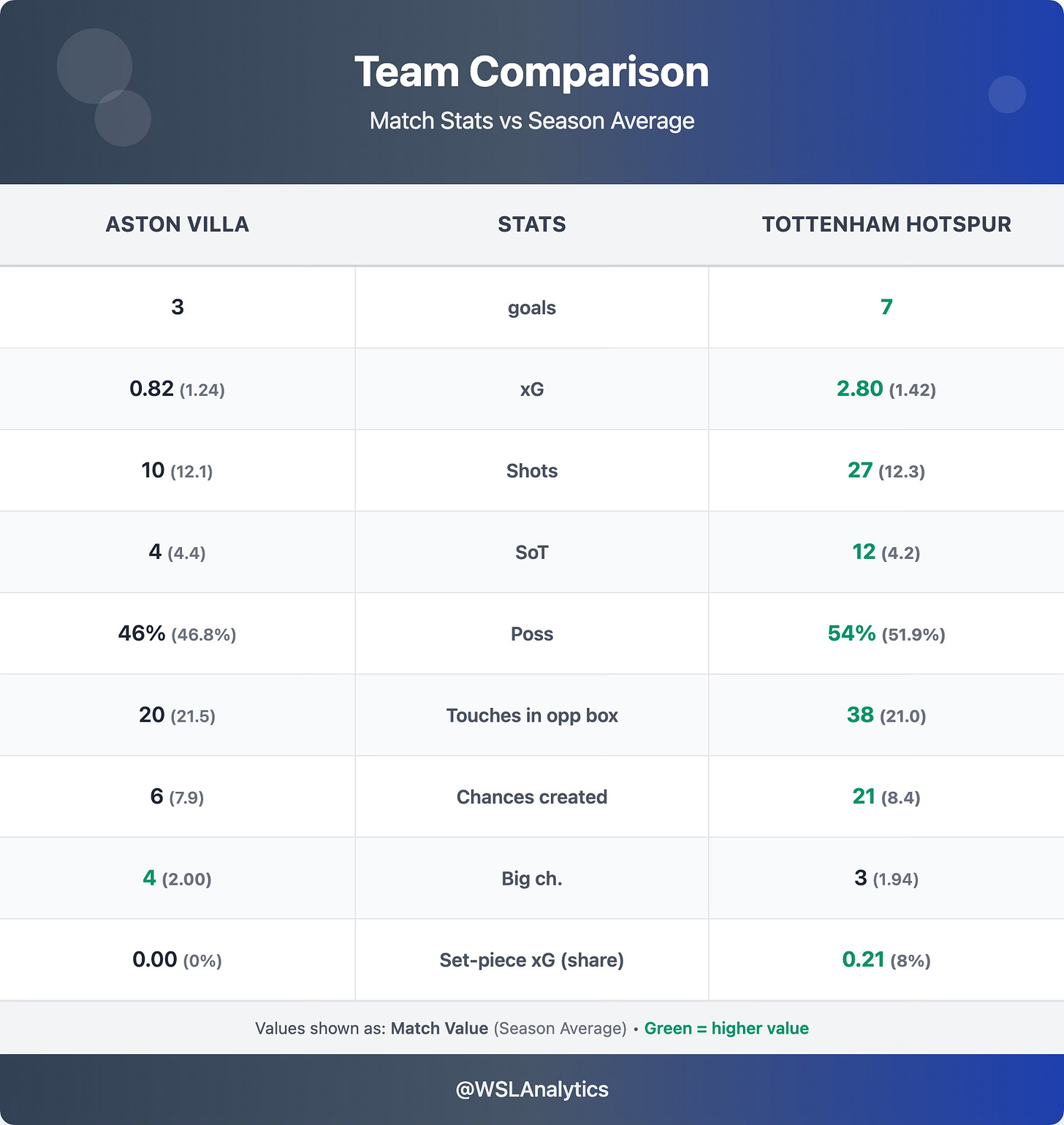 Aston Villa were below their season baseline in almost every attacking metric – 10 shots vs a 12.1 average, 6 chances created vs 7.9, and just 0.82 xG vs their 1.24 average (≈0.66×). However, they did create 4 big chances – double their 2.00 season average – and were remarkably clinical in converting them, scoring 3 goals from 0.82 xG. The issue was entirely at the other end: they simply could not stem the tide of Spurs attacks.