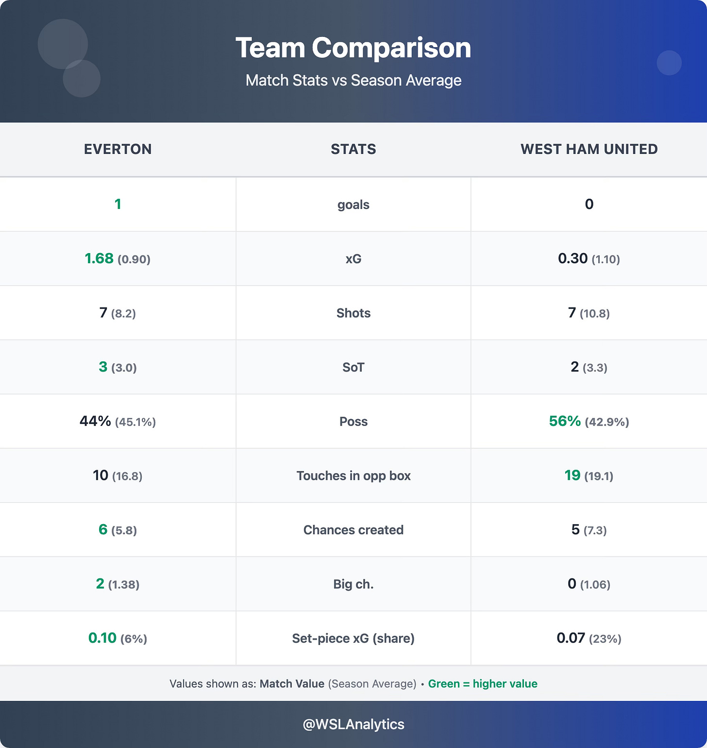 West Ham had plenty of the ball (56% possession) and matched their season average for touches in the opposition box (19), but turned it into almost nothing. Their 0.30 xG was barely a quarter of their 1.10 season average (≈3.7× below), and they failed to create a single big chance – 0 vs a 1.06 average. Lots of territory, zero cutting edge.