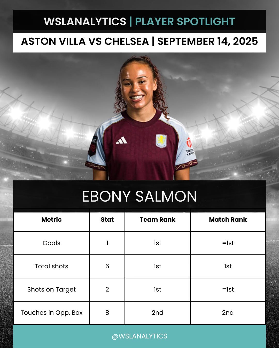 Player Spotlight — Ebony Salmon (Aston Villa – FW): Bright spark in a 1–3 defeat — scored Villa’s only goal v Chelsea, led the match with six shots, joint-most on target (2), and eight touches in the box.