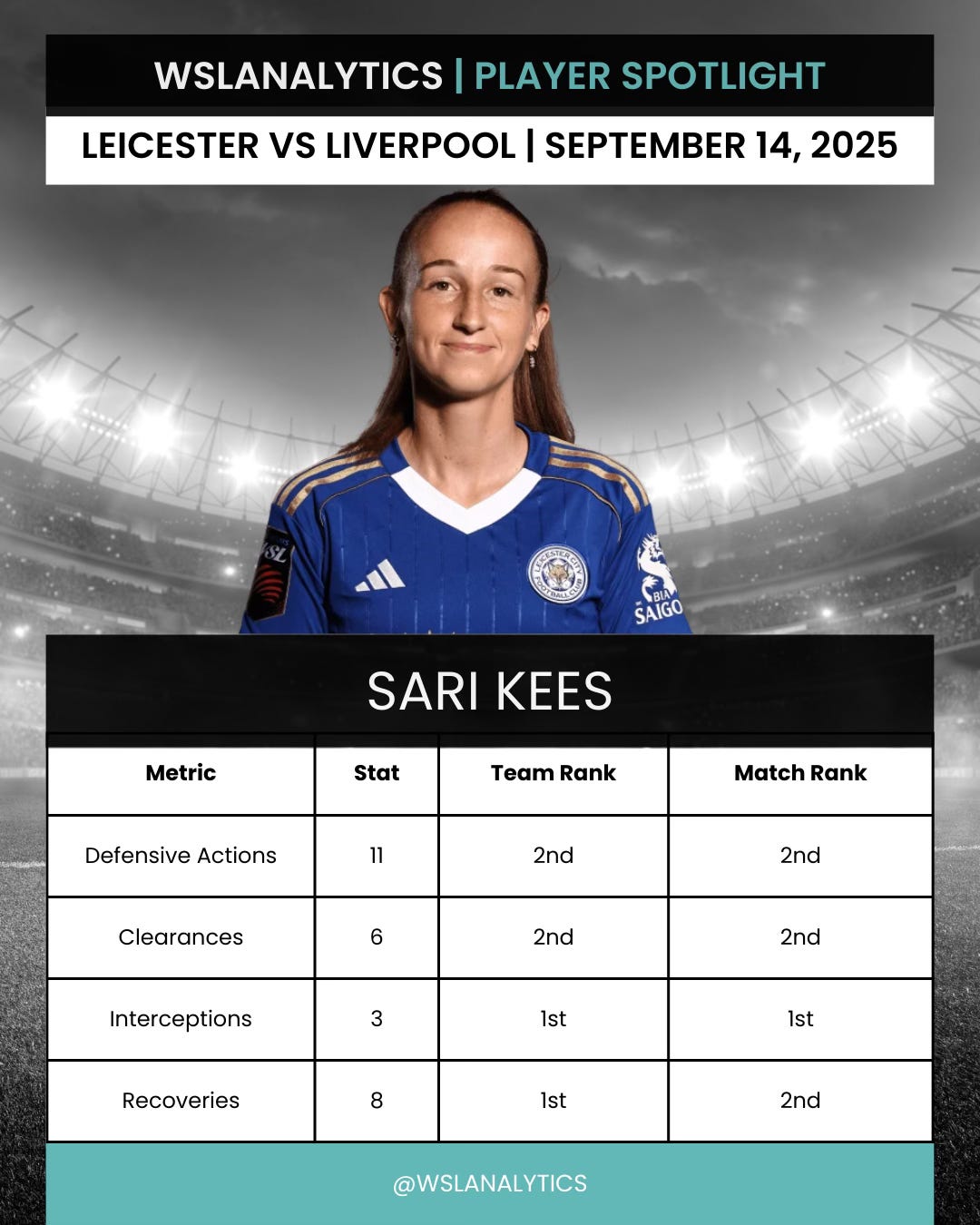 Player Spotlight — Sari Kees (Leicester City, CB): 11 defensive actions and 4 duel wins, 3 interceptions (match-high) anchoring a back line that refused to break.