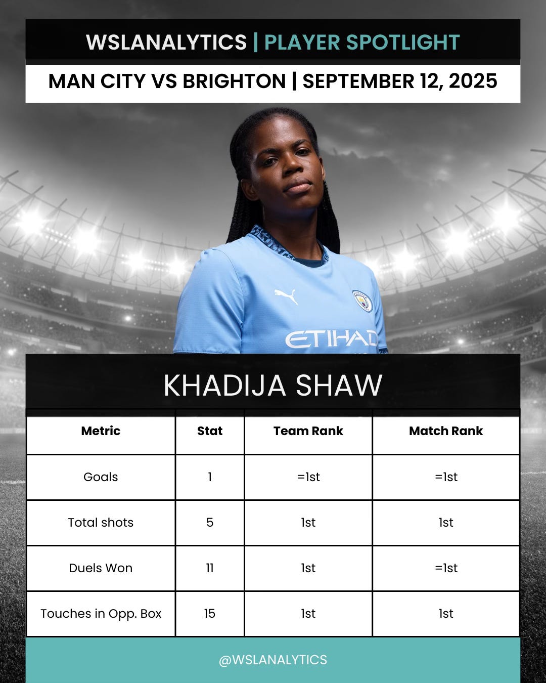 Player Spotlight — Khadija Shaw (Manchester City, FW): Relentless No. 9 — match-high 5 shots and 15 touches in the box, 11 duels won, and a goal to cap a dominant display.