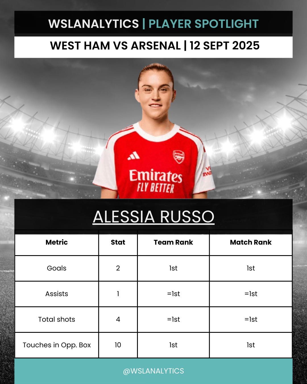 Player Spotlight — Alessia Russo (Arsenal, ST): Led the line brilliantly and earned a late brace. Movement, hold-up and pressing stood out; her two goals capped a dominant display.