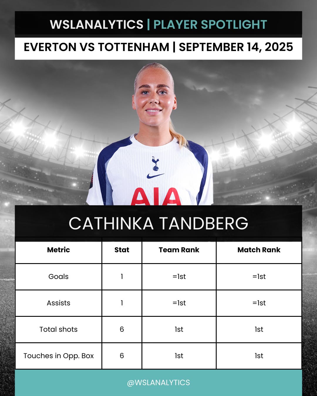 Player Spotlight — Cathinka Tandberg (Tottenham, FW): A constant menace: 1 goal, 1 assist, 6 shots, 3 chances created. Her 49’ long-range curler effectively sealed the win and showcased individual quality.