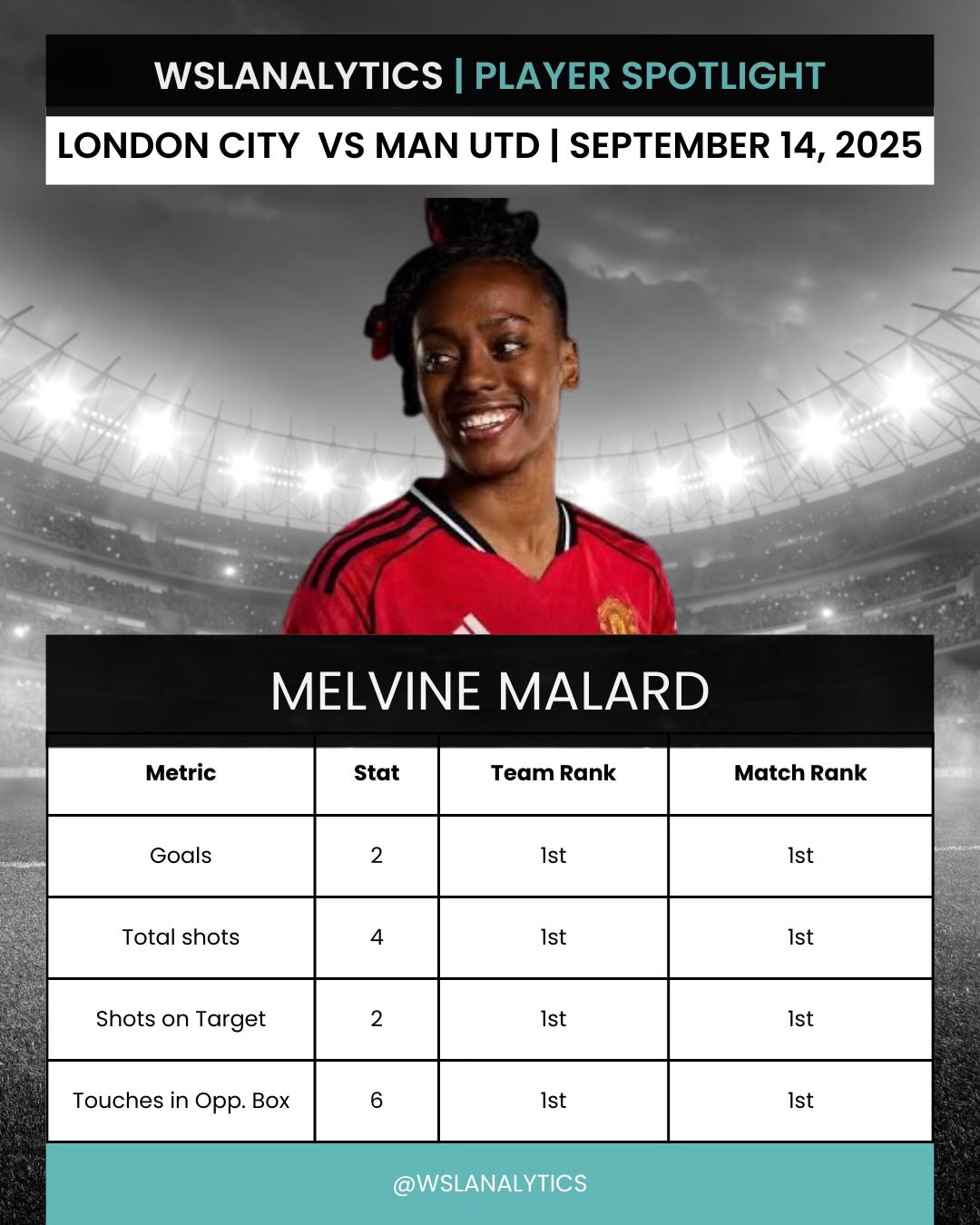 Player Spotlight — Melvine Malard (Manchester United, FW): Earned the early penalty and added a second-half brace (4 shots, 2 goals), constantly occupying LCL’s defence.